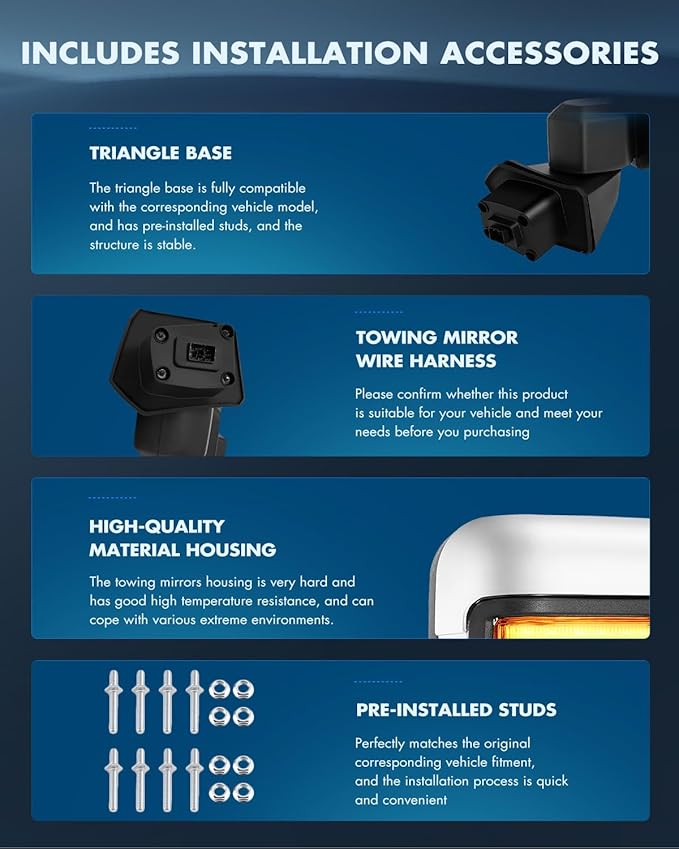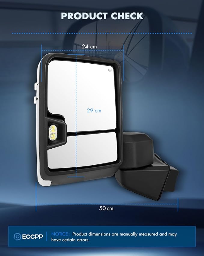 - Multifunction Of Tow Mirrors - Choose from towing mirrors equipped with many different Functions: Power Adjusted,Heated,Turn Signal Light,Width Light,Puddle Light,Running Light,Back-up Light,Temperature Sensor,Chrome Housing,Manual Folding