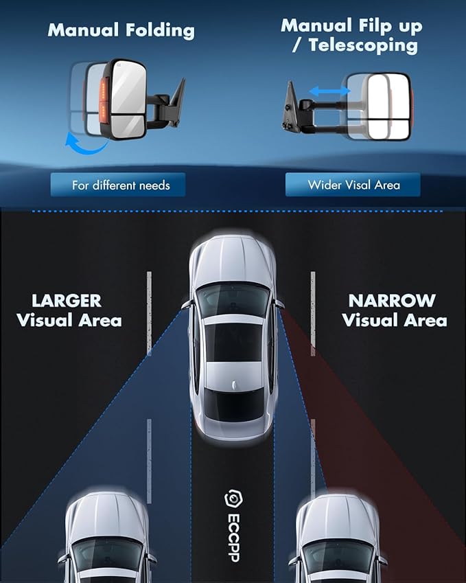 - Multifunction Of Tow Mirrors - Choose from towing mirrors equipped with many different Functions: Power Adjusted,Heated Function,Turn Signal Light,Manual Telescoping and Folding,with Black Housing