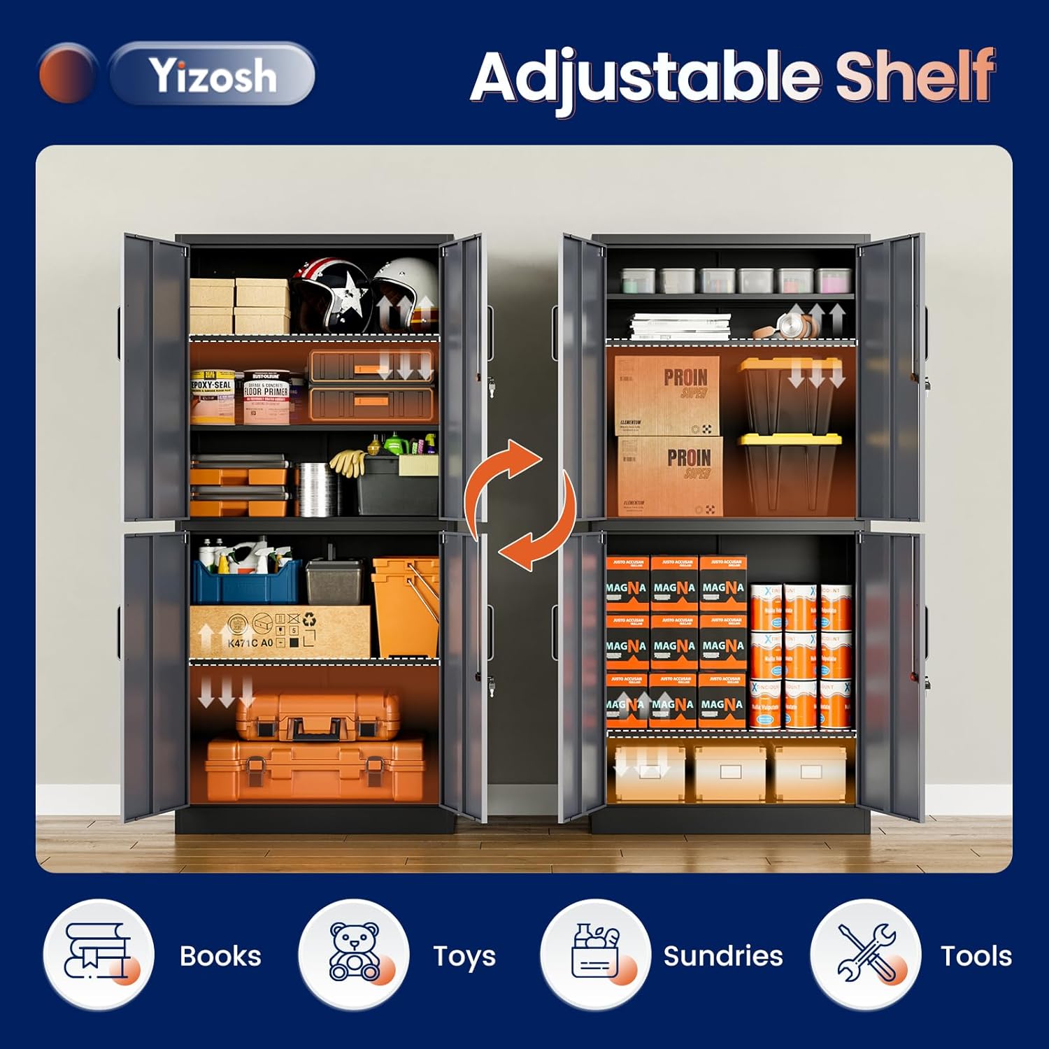 Yizosh Metal Storage Locking Cabinet with 4 Doors and 2 Adjustable Shelves,71" Lockable Garage Tall Steel Cabinet,for Home Office,Living Room,Pantry,Gym,Commercial Storage (Gray Black)