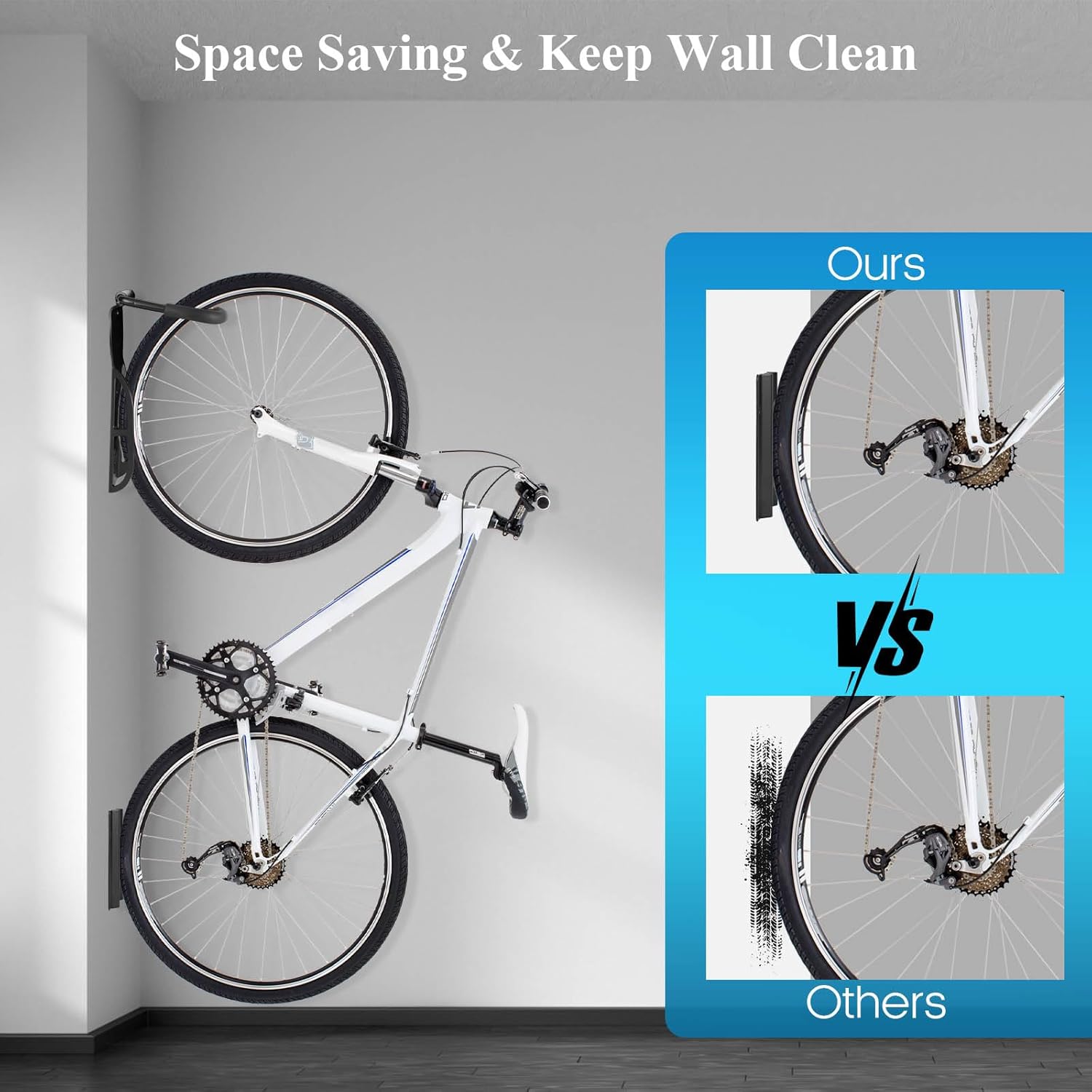 - Space-saving: Lifts bikes off the floor, the vertical bike hanger maximizes the use of wall space, providing efficient storage for your bicycles.