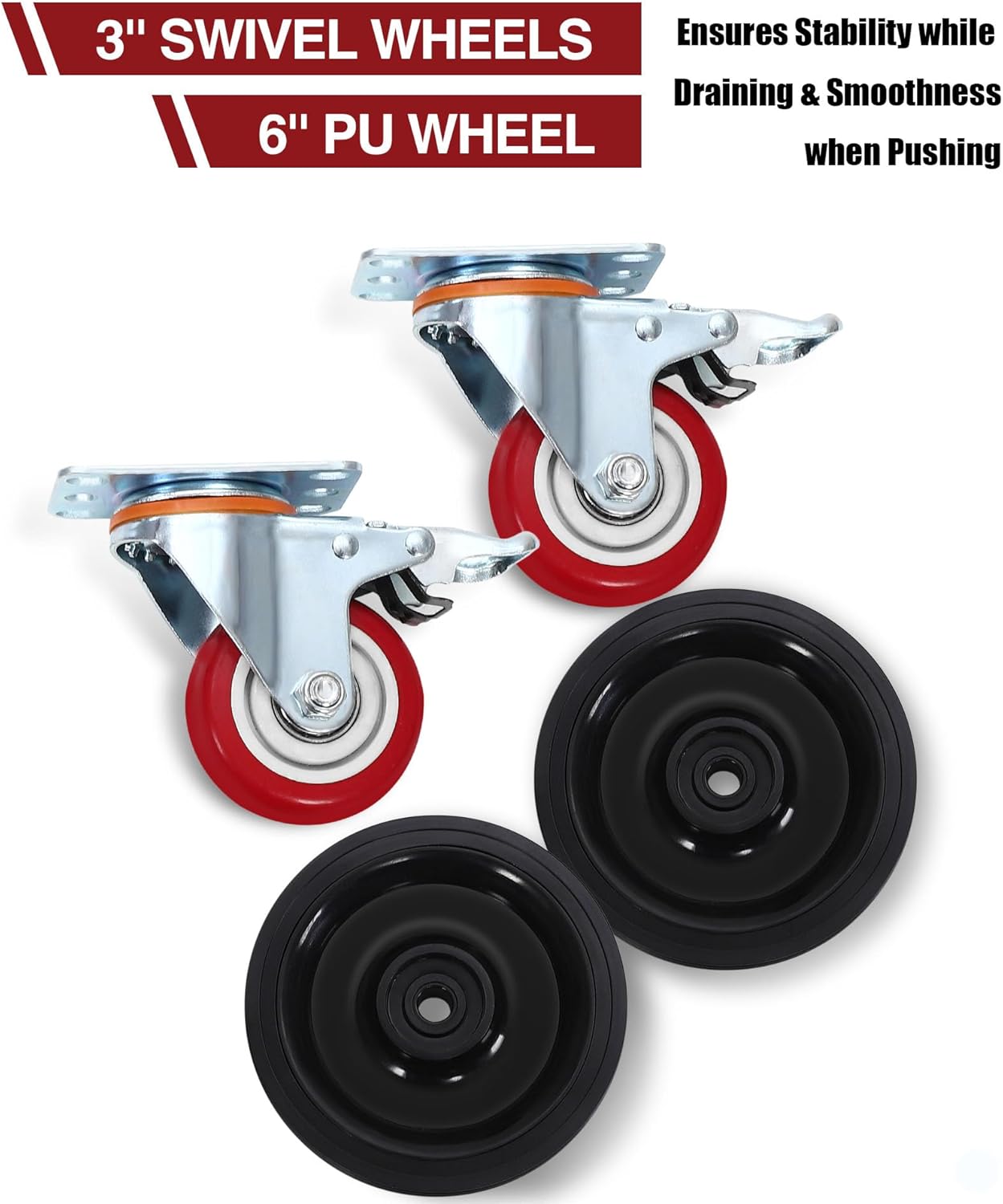 - š[CASTER DESIGN]- DEXSO oil drain pan features four caster wheels (two fixed and two free), that allow for easy mobility and positioning, making oil-changing a breeze. The fixed wheels provide stability and support, while the free wheels allow for smooth movement around the garage or workshop floor.