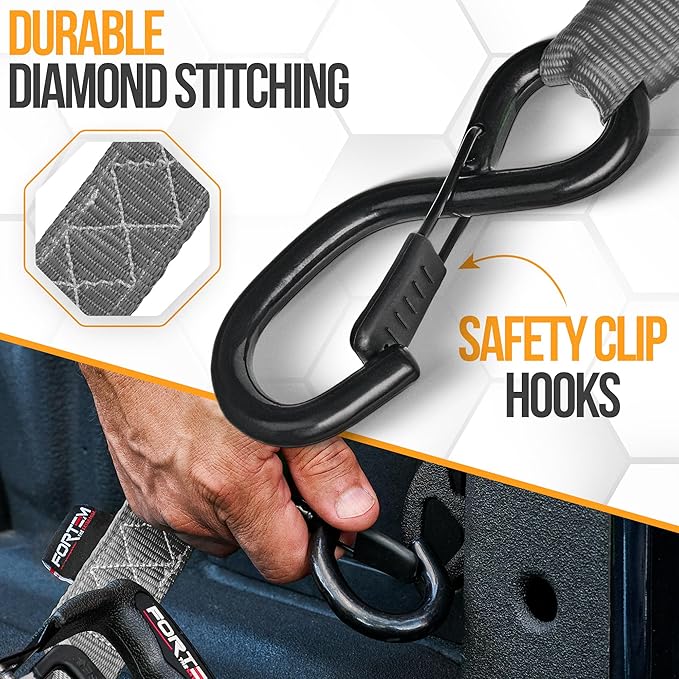 - Multifunctional – Tie down straps ratchet mechanism offers durability and security to transport a variety of objects. Securely tie down your motorcycle, bike, kayak, UTV, boat, ATV, boxes, boat, cooler, & other cargo via trailers, or car roof rack.