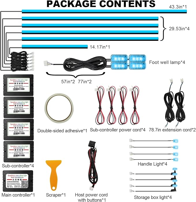- Included Components : 6 acrylic fiber optic light strips, 4 car interior foot well lamps, 4 door handle lights, 4 doors storage box lights, one master controller, and 4 sub controllers 6 acrylic fiber optic light strips, 4 car interior foot well lamps, 4 door handle lights, 4 doors storage box lights, one master controller, and 4 sub controllers