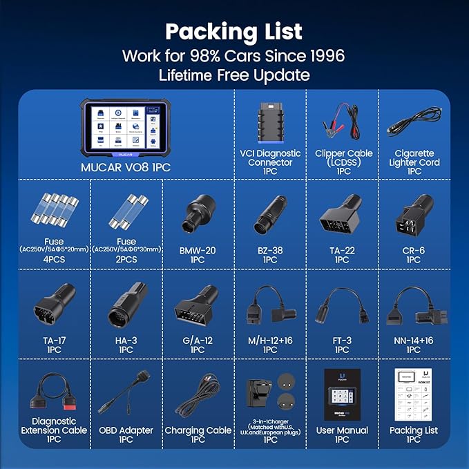 - [Stay Ahead with Free Lifetime Upgrades] Never miss a new feature or software optimization—regular updates keep your tool cutting-edge. You can easily update your scanner tool with just a few clicks. Package includes: VO8, Bluetooth Dongle, Carrying Case, 15*Connector and Adaptors, US/UK/EU Power Adapter, OBD Extension Cable, Type C Cable, User Manual. Questions? Contact service@ mucarco. com—we're here to help!