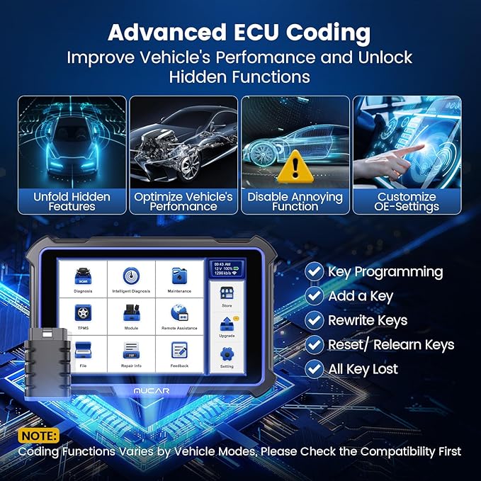 - [Deep ECU Coding, Unlock Vehicles Potential!] Go beyond basic scans, this VO8 scanner offers advanced ECU coding enhancing performance and driving experience like never before. Reprogram adaptive data, customize OE settings, perform PMI, power balance, and activate dormant features for enhanced performance. Perfect for component replacement, performance tuning, and vehicle personalization. (Compatibility varies by model.)