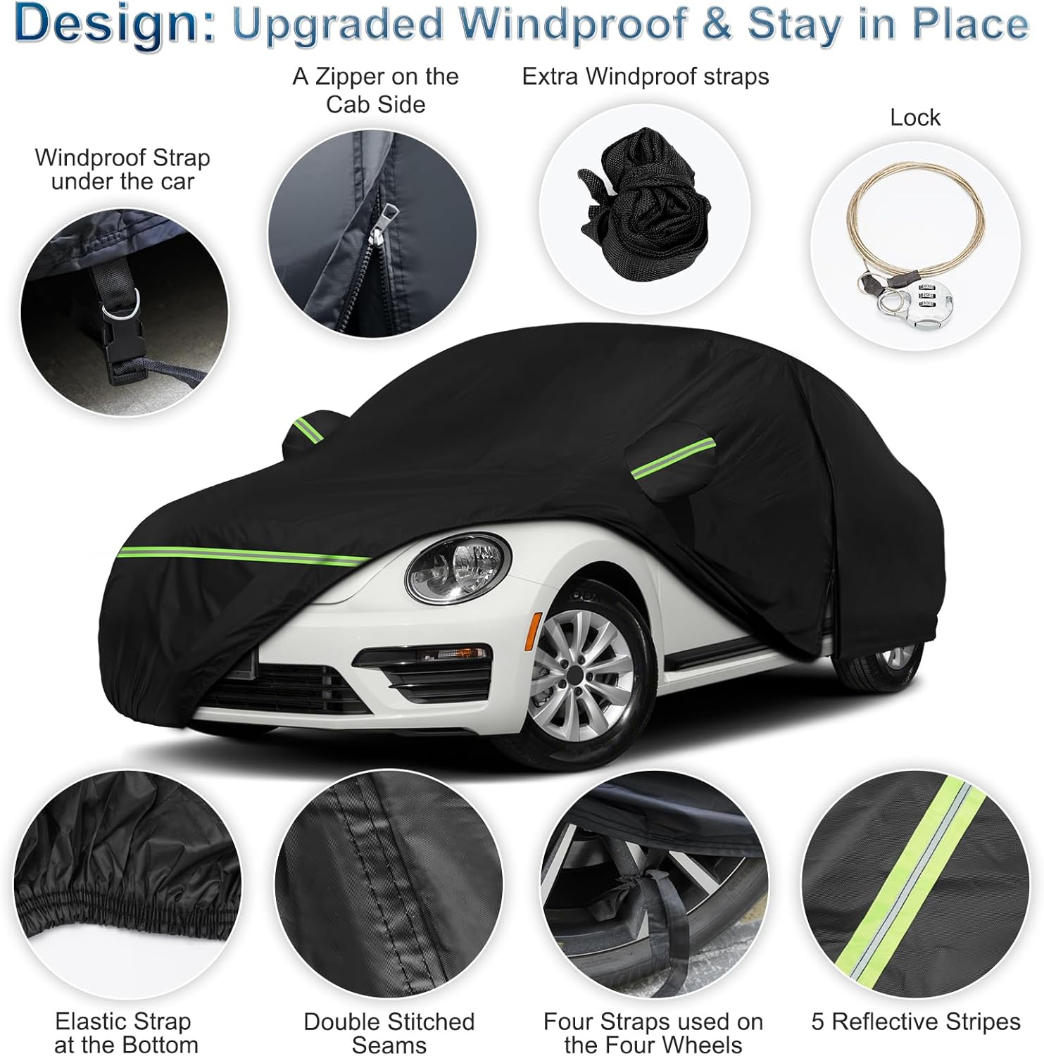 for New Beetle Car Cover Waterproof All Weather Heavy Duty Protection Outdoor Light Shell Full Car Covers Windproof with Driver Side Zipper Compatible with 1998-2025 Volkswagen New Beetle(Up to 194")