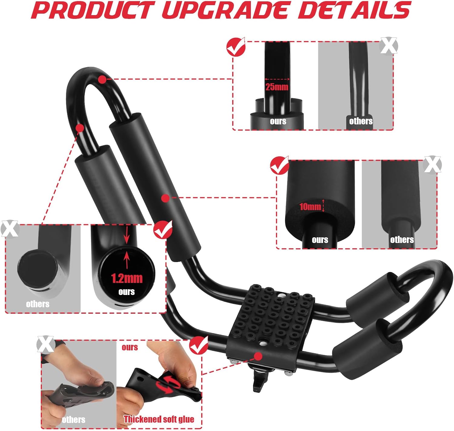 - ăUpgrade Thicken DesignăOur kayak roof frames are made of high-strength carbon steel. The thickened tube wall (1.2mm) and diameter (25mm) make the roof frame stronger. The widened design can support two heavy kayaks up to 150lb. Rust-resistant and corrosion-resistant material features you can keep on the car roof for a long time.