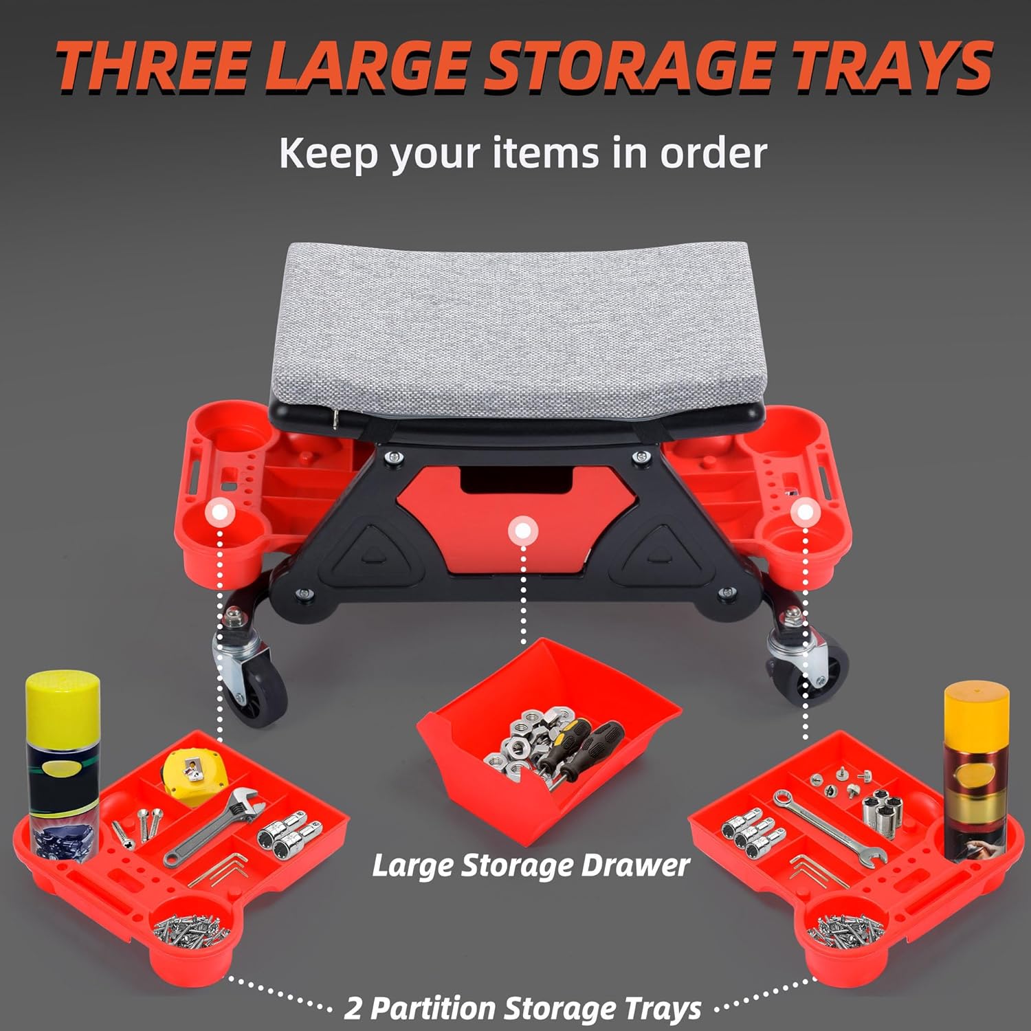- Ample Storage Space: The Rolling stool is equipped with removable clip-in trays and sliding front drawer, which can organize and store just about anything, such as detail brushes, microfiber towels, spray bottles etc. And tray features screwdriver holes and two multi-purpose cup holders.