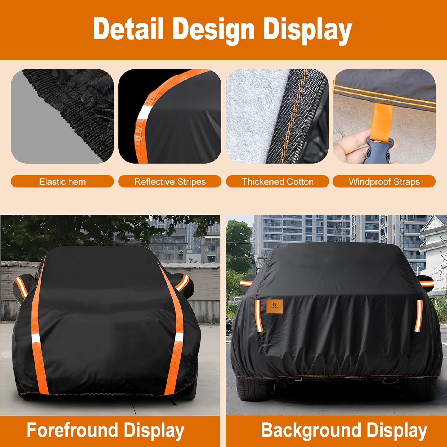 - ăUnique DesignăDriver door zipper, Take something in the car will be more convenient. 4 Windproof straps at Front&Rear to prevent the cover from being blown away in heavy wind. 1 Storage bag , Store your cover easily when not used. For added safety, four reflective stripes enhance visibility at night, alerting others to your vehicle's presence. Mirror Pocket, Help you easily put on the cover.