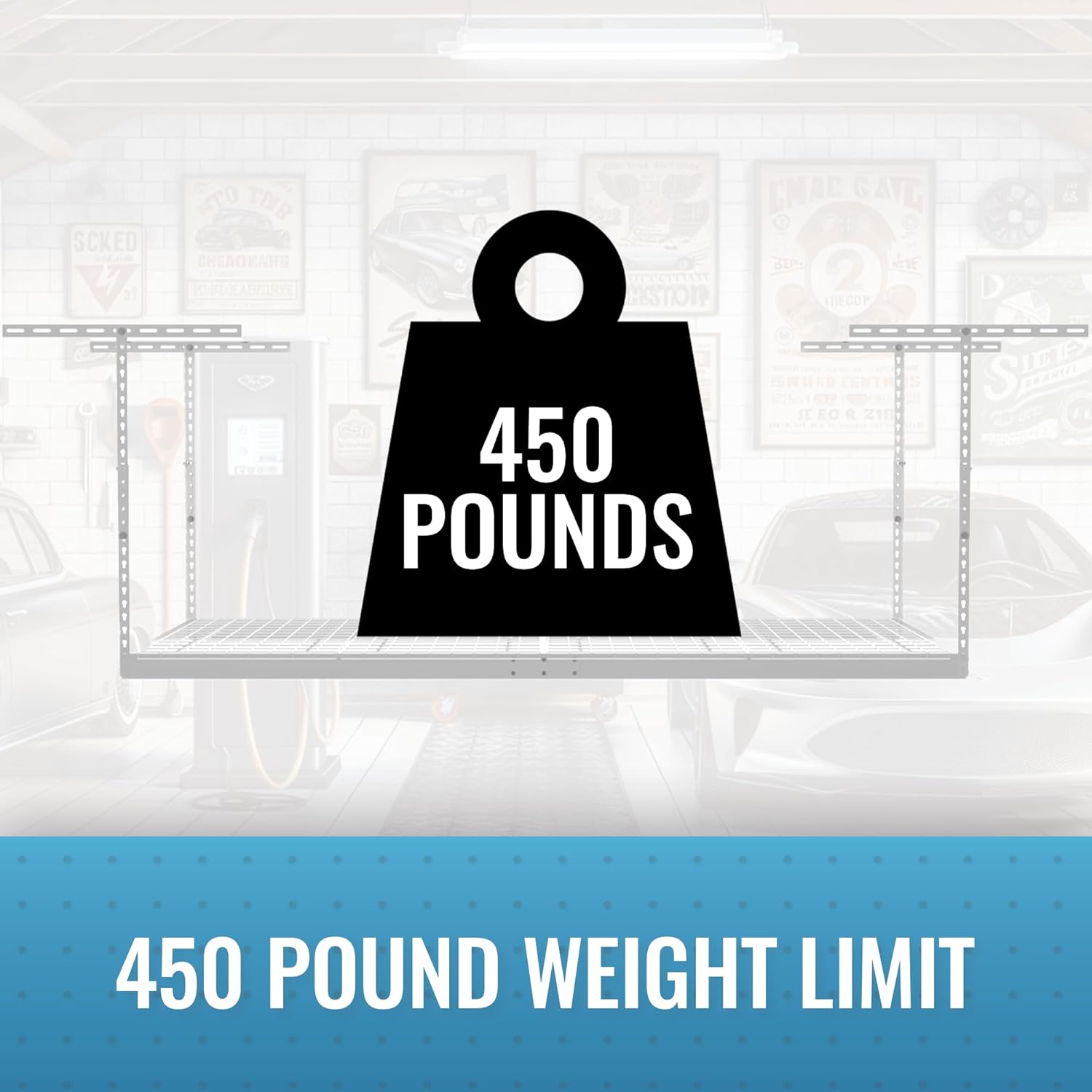 - INDUSTRIAL STRENGTH: Our industrial strength overhead garage racks are designed to hold up to 500 lbs each and are perfect for storing bikes, construction tools, storage bins, holiday decorations, and other items and accessories. The powder coat finish provides a durable, scratch, water, and rust-resistant surface; while case-hardened hardware and our patented ceiling brackets provide additional strength and safety for this hanging shelf.