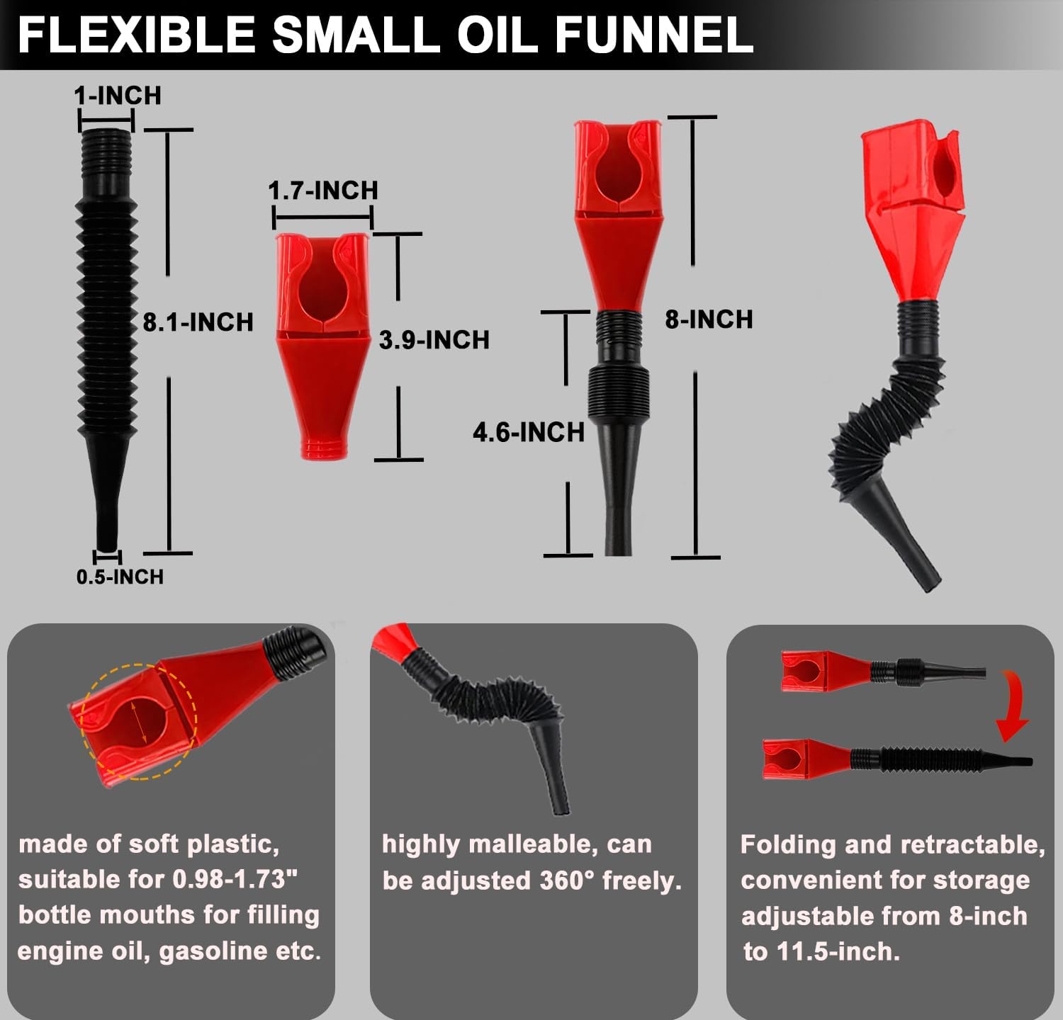 - Reliable Quality: The oil filter wrenches made of sturdy stainless steel for corrosion-resistant and highly strength,the oil filter pliers made of high-quality forged carbon steel that have heavy-duty structure and unique jaw design, The oil funnel is made of high quality ABS material which has wide neck and wide spout allow for quick filling of oil without spills.