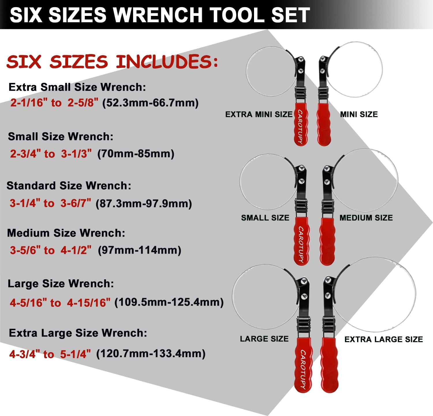 - Six Sizes Wrench: Extra small size: 2-1/16"-2-5/8", small size #2: 2-3/4"-3-1/3", Standard size: 3-1/4"-3-6/7", Medium size: 3-5/6"-4-1/2", Large size: 4-5/16"-4-15/16", Extra large Size: 4-3/4"-5-1/4".