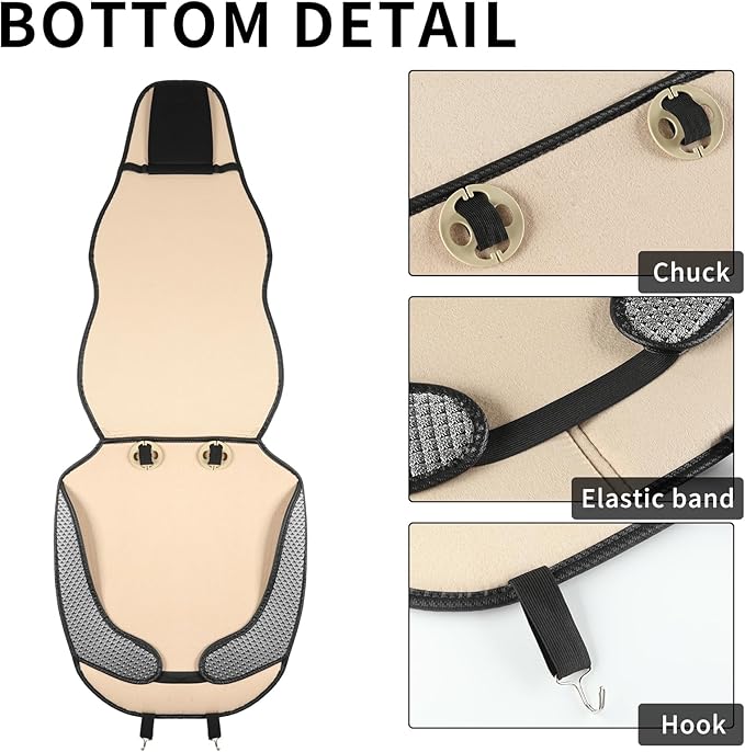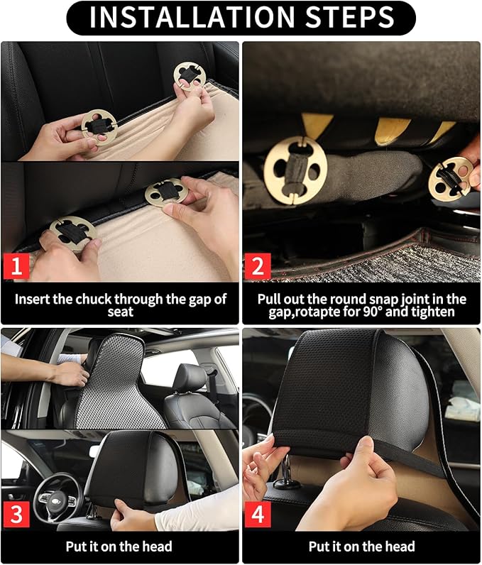 - 【Easy to install】 2 minutes after watching the video. The installation only needs 3 steps, just hang two metal hooks under the seat, clip the two chucks on the seat back, and fix the clips on the back cover and headrest cover.