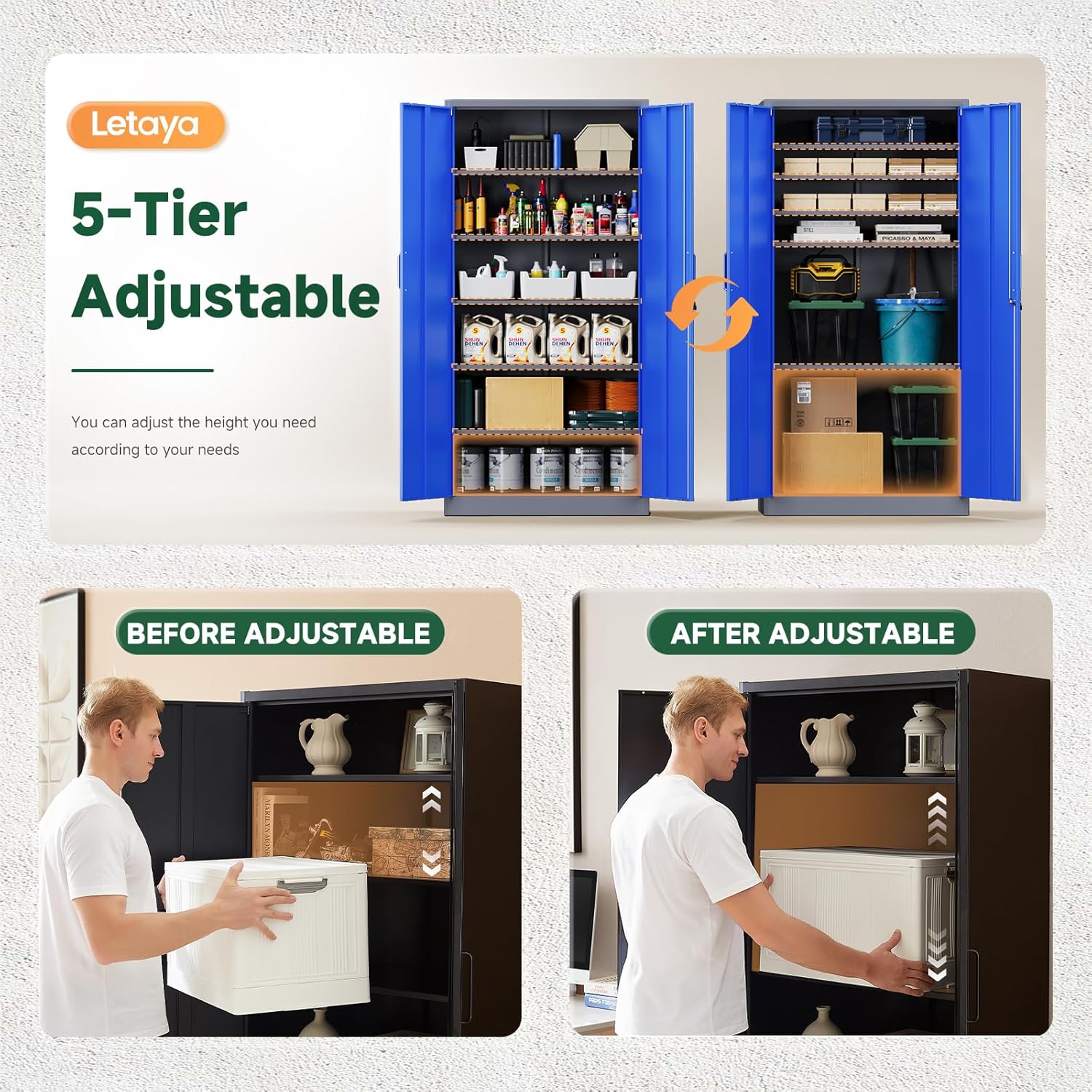- 『Durable Metal Material』: Letaya metal storage cabinet is made up of 0.8mm steel ,rugged and not easily deformed, plate adopted environmentally powder coated finish, moisture proof ,capacity to resist corrosion and rust.