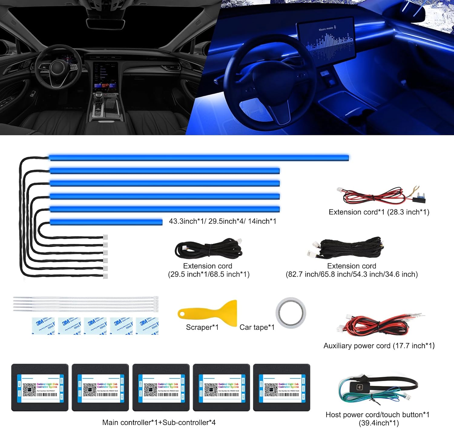 - ăHigh Bright & UniformăThe Acrylic Car Ambient Lighting have super bright LED and acrylic lens and contains 6 LED strips (4*29.5inch+1*43.3inch+1*14inch), also comes with 1 main controller and 4 sub controllers,and can be flexibly installed on any car by DIY without disorganized, which is plug and play, and this acrylic light evenly spread over the lamp strip is brighter, more uniform and softer than other optical fiber lamps that rely on only one LED.