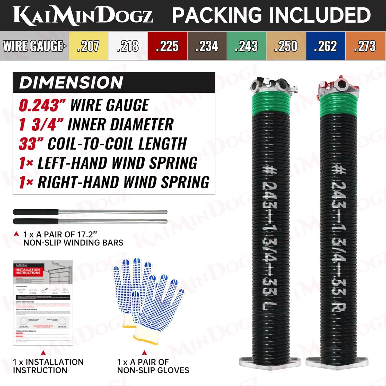 - DIMENSION : One Pair of .243” wire size x 1.75” inside dimension x 33” length Garage Door Torsion Spring. (left & right)