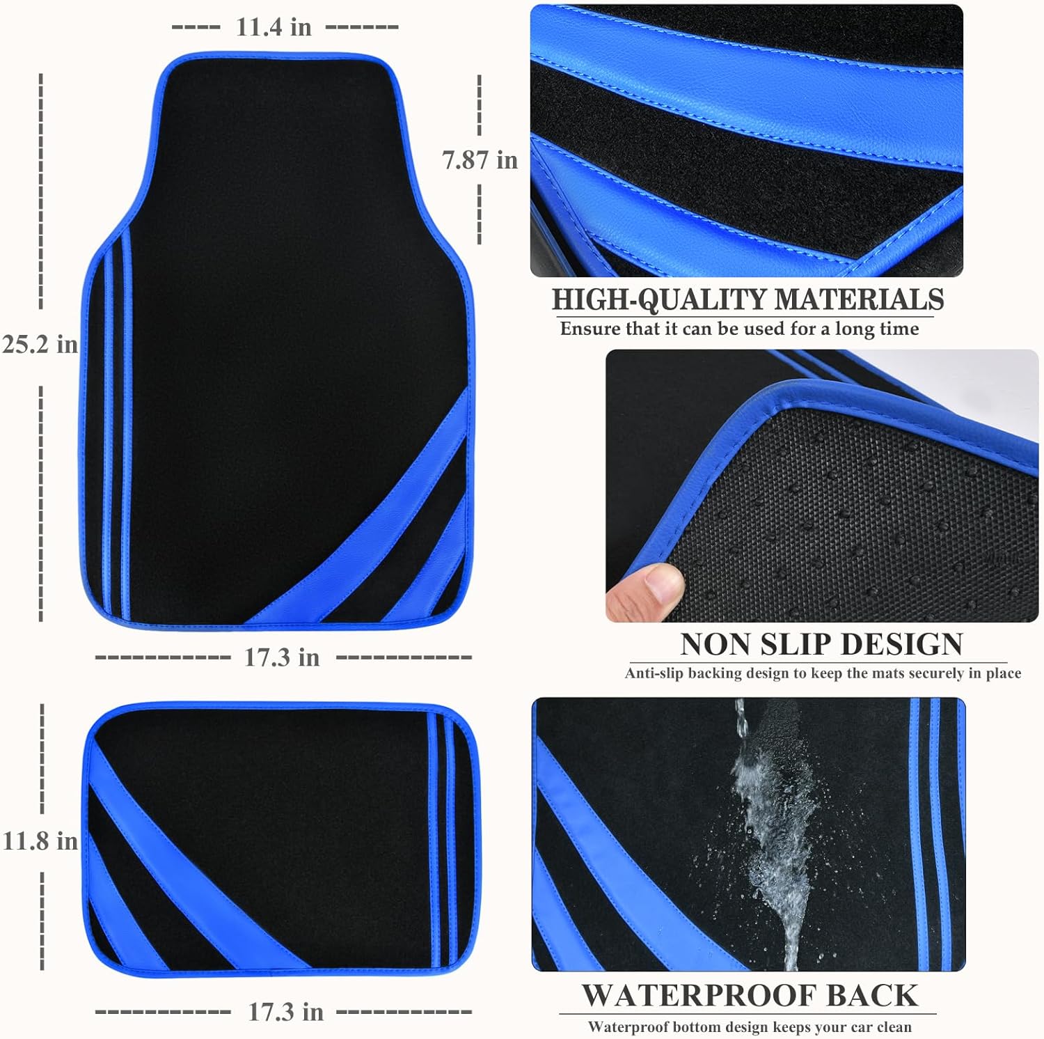- 【High Quality】The edges and blue lines are made of leather and double stitched for superior quality. The center carpet portion is soft and thick, which traps dust and dirt well and Protect your vehicle's flooring against spills, stains, dirt and debris.