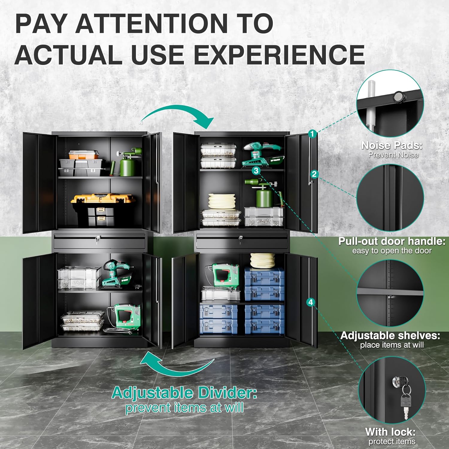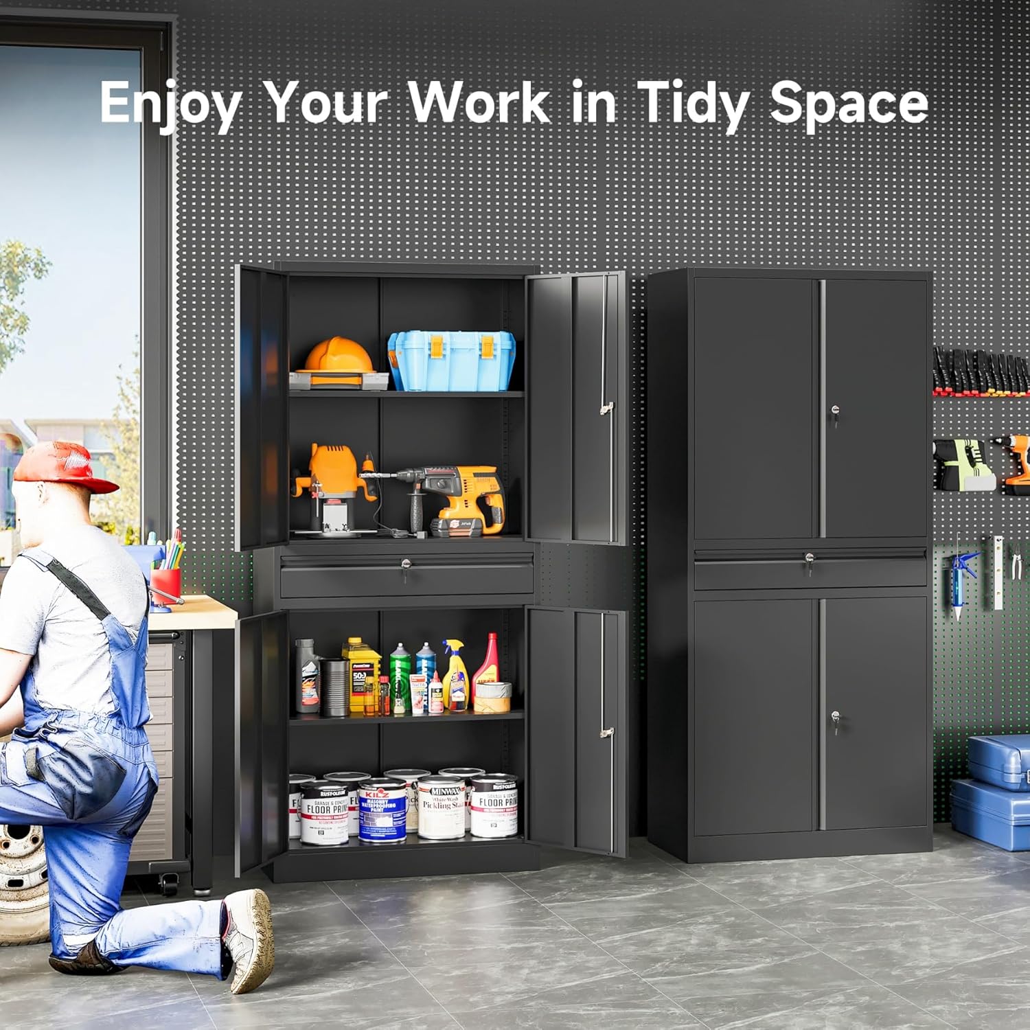 - âď¸âăAdjustable Shelf Designă: The garage cabinets storage uses 2 adjustable shelves. You can move to the desired height by adjusting the shelf pegs according to the size of the things. so that you can divide the office storage cabinet space distribution. You can also design garage storage flexibly and remove the shelves for more standing room