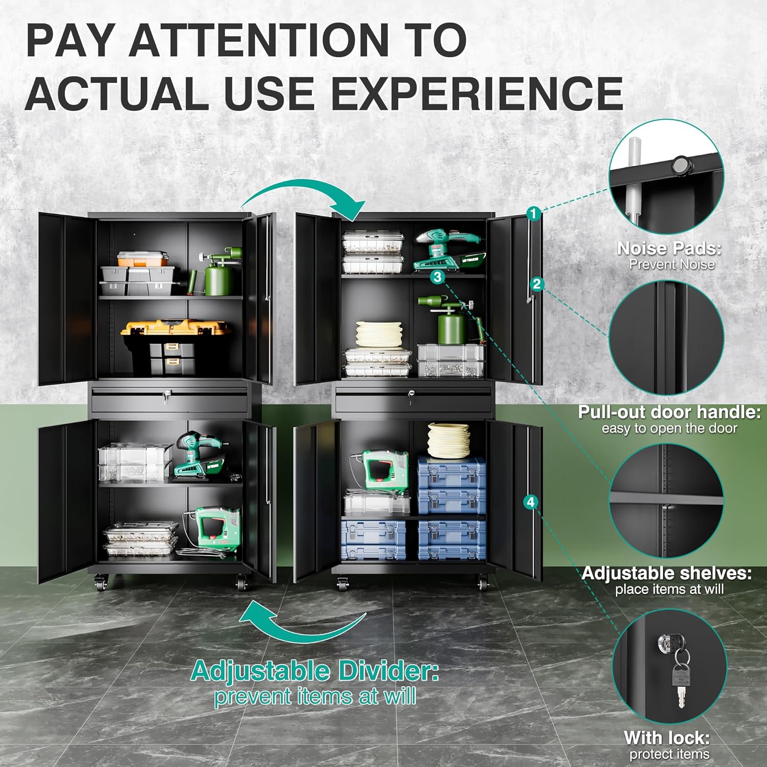 - âď¸âă1 Drawer and 2pc Adjustable Shelfă: The garage cabinets storage uses 2 adjustable shelves. You can move to the desired height by adjusting the shelf pegs according to the size of the things. so that you can divide the office storage cabinet space distribution. You can also design garage storage flexibly and remove the shelves for more standing room