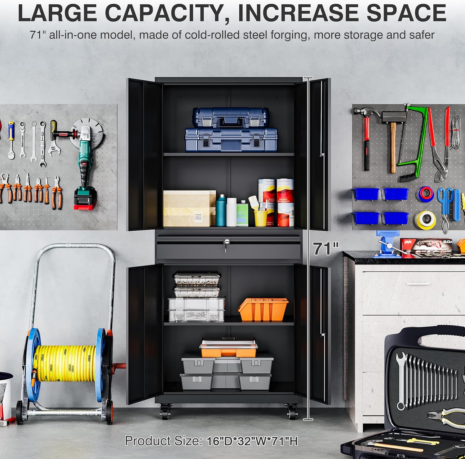 - âď¸âăEasy to Move with 4pc Wheelsă: This metal storage cabinet has a strong and durable metal frame with excellent load-bearing capacity, allowing you to store enough items. Weight Capacity: 600 lbs total, the lockable storage cabinet has 2 adjustable shelves and a drawer, each shelf holds: 180 lbs
