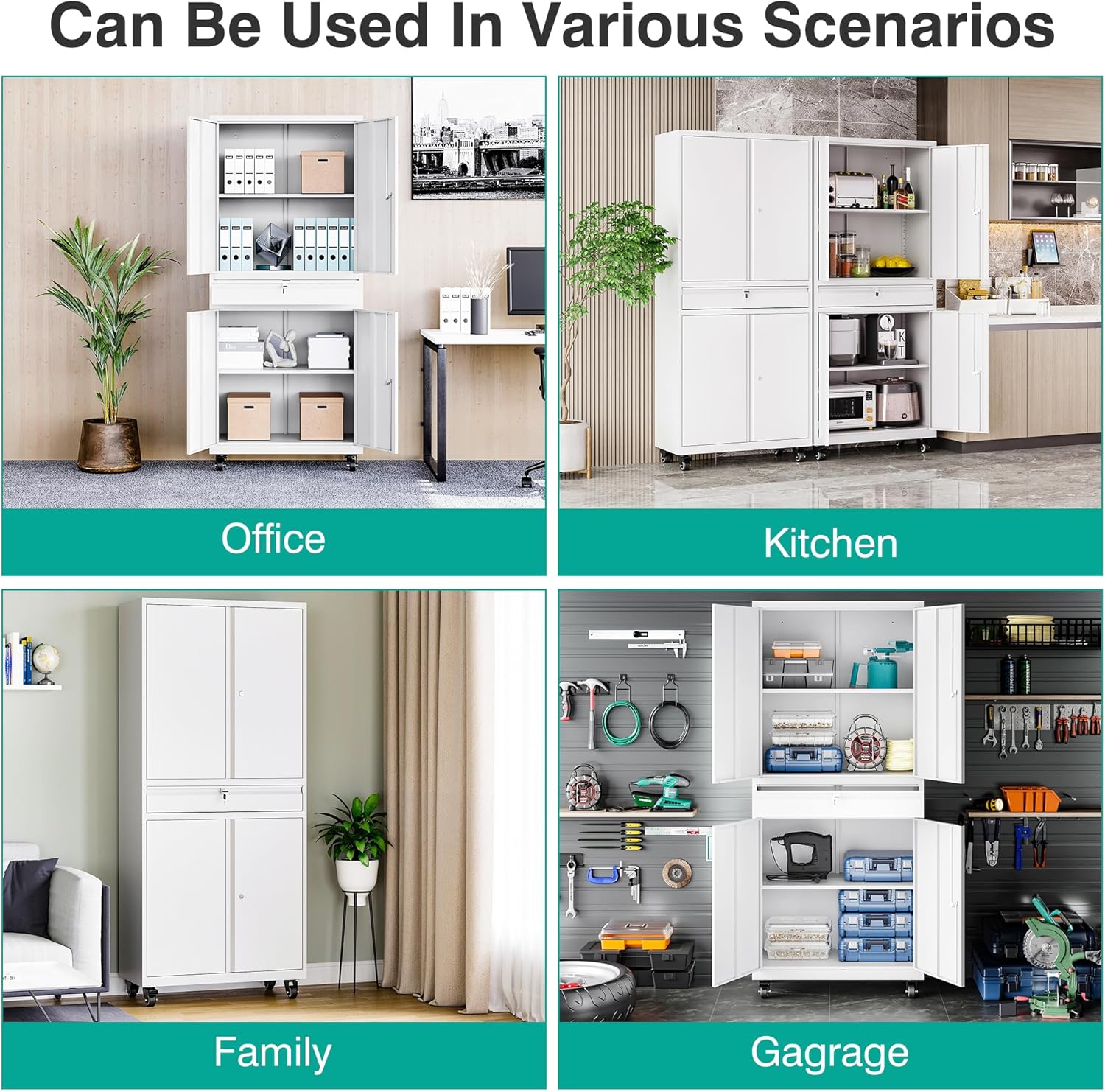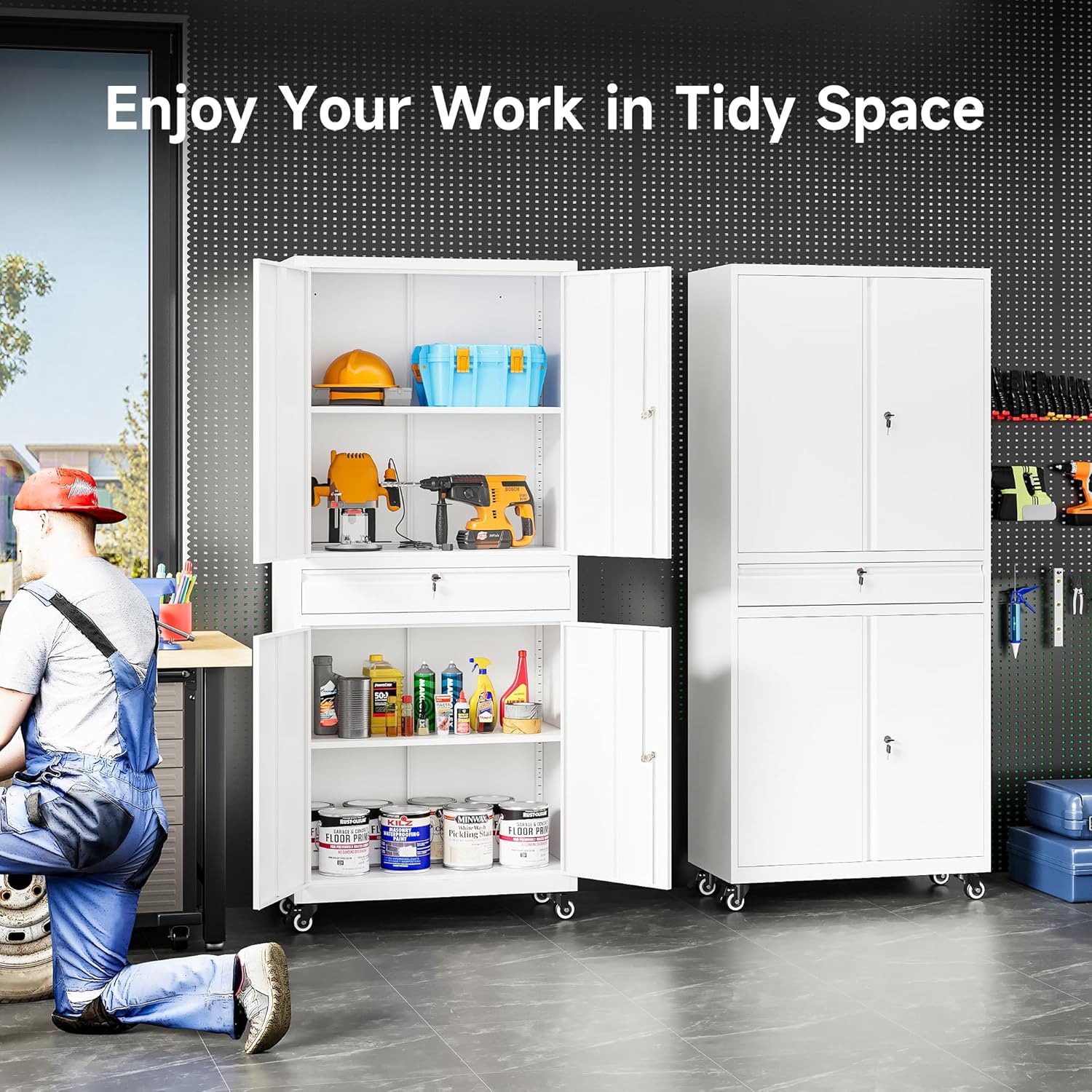 - 1 Drawer and 2pc Adjustable Shelf: The garage cabinets storage uses 2 adjustable shelves. You can move to the desired height by adjusting the shelf pegs according to the size of the things. so that you can divide the office storage cabinet space distribution. You can also design garage storage flexibly and remove the shelves for more standing room