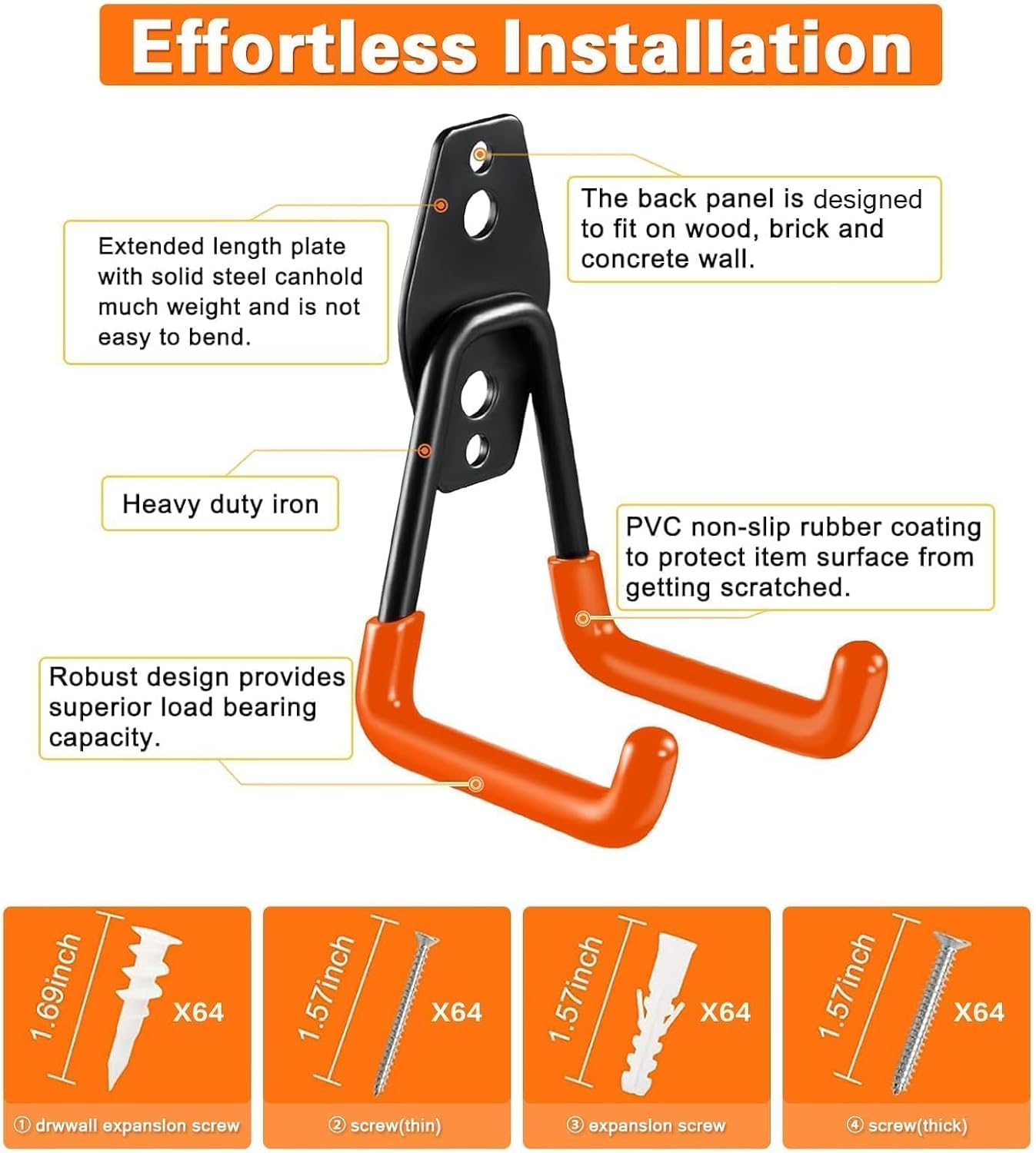 - 【Easy Installation & Easy to Get Started】 Although Jack is not good at professional installation, he found that the installation of GUDEMAY heavy-duty garage hooks are very simple. GUDEMAY store gives away 4 different types of screws, each with 64 pieces.Just use the included screws to fix the hooks to the wall. He quickly completed the installation and began to enjoy the convenience brought by the hooks. This made him more confident to complete the garage organization work, and now his garage has a brand new look.
