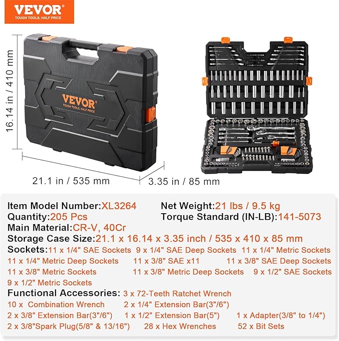 VEVOR Mechanics Tool Set, 1/4" & 3/8"& 1/2" Drive Deep and Standard Sockets, SAE/Metric 205 Pcs Mechanic Tool Kit with Bits, Combination Wrench, Hex Wrenches, Accessories, Storage Case