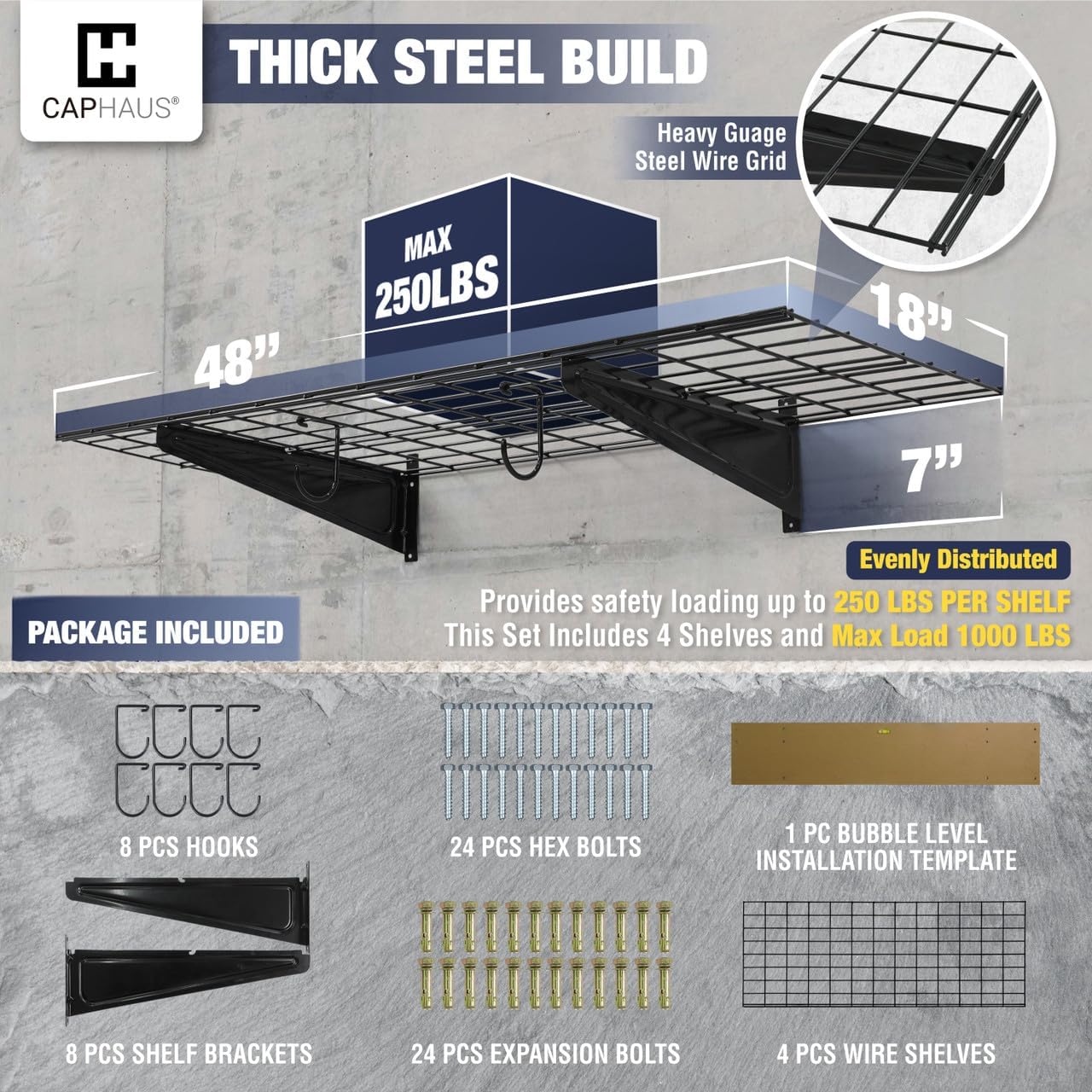 - šØ Various Size Choices - This option includes FOUR wall shelves, EIGHT Versatile hooks, and all necessary hardware. Each shelf measures 48 inches in width and 18 inches in depth, providing a total of 192 inches in width. Opt for the silver hex bolt for concrete and wooden walls and choose the golden expansion bolt for secure installation on brick walls. Heavy gauge steel construction provides safety loading up to 250lbs total per shelf, this set providing a total weight capacity of 1000 lbs.
