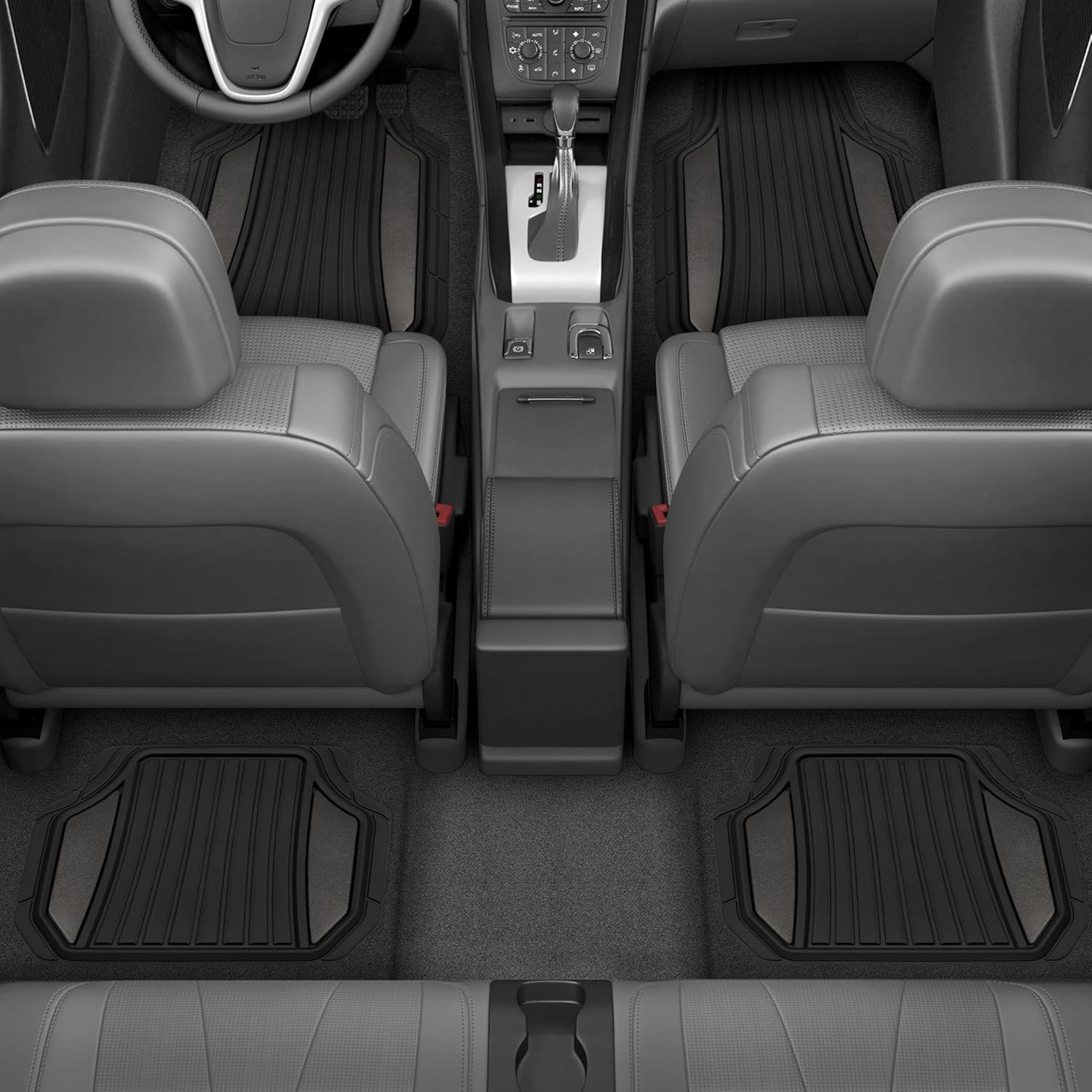 - STYLISH TWO-TONE DESIGN – These car mats full set feature a sleek black and chrome-tech finish that adds a sporty look to your vehicle. Perfect for those upgrading their car accessories for men, women, or anyone who loves modern interior accessories.