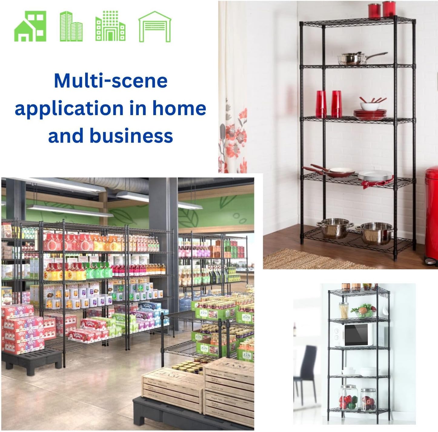 - STURDY AND SPACIOUS STORAGE SOLUTION:This 5-tier wire shelving unit provides ample storage space for your home or office. Each high-quality shelf can hold up to 250 pounds of evenly distributed weight, making it ideal for storing a variety of items. The shelves are 14 inches deep and 36 inches wide, offering plenty of room for bins, boxes, and other containers.