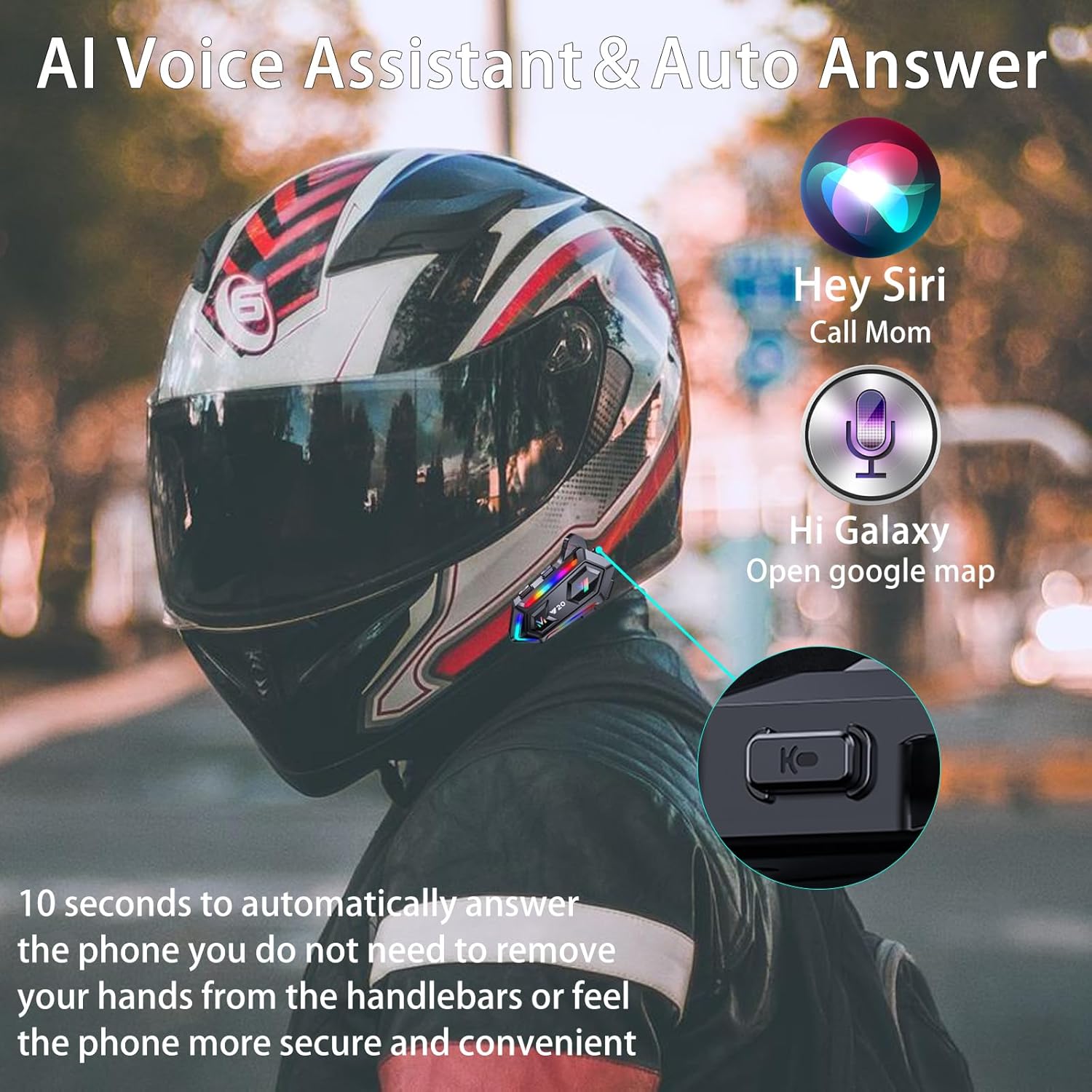 - 【Auto Answer & AI Voice Assistant】The motorcycle helmet speakers can automatically answer hands-free communications in 10 seconds. You can answer phone calls more safely and conveniently, without removing your hands from the handlebars or fiddling with your phone. By simply pressing the helmet speakers voice control button, you can easily summon a voice assistant or Siri to perform a variety of tasks without taking your attention off the road.