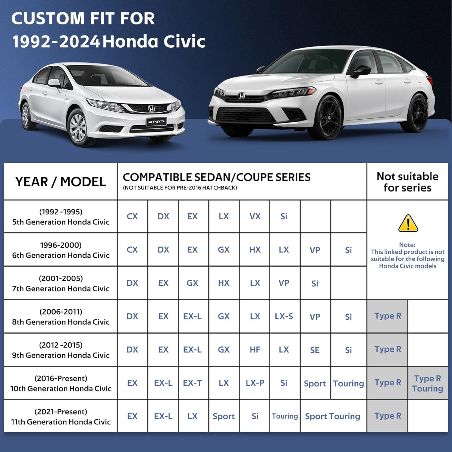 - ăPerfect Fităâ Holthly has conducted experiments to obtain a customized car cover specifically designed for Honda Civic (1991-2024). The custom-like fit of the full cover not only enhances the -aesthetics of your vehicle but also provides superior wind resistance, thereby prolonging the lifespan of the hood. It offers enhanced and long-lasting protection for your car.