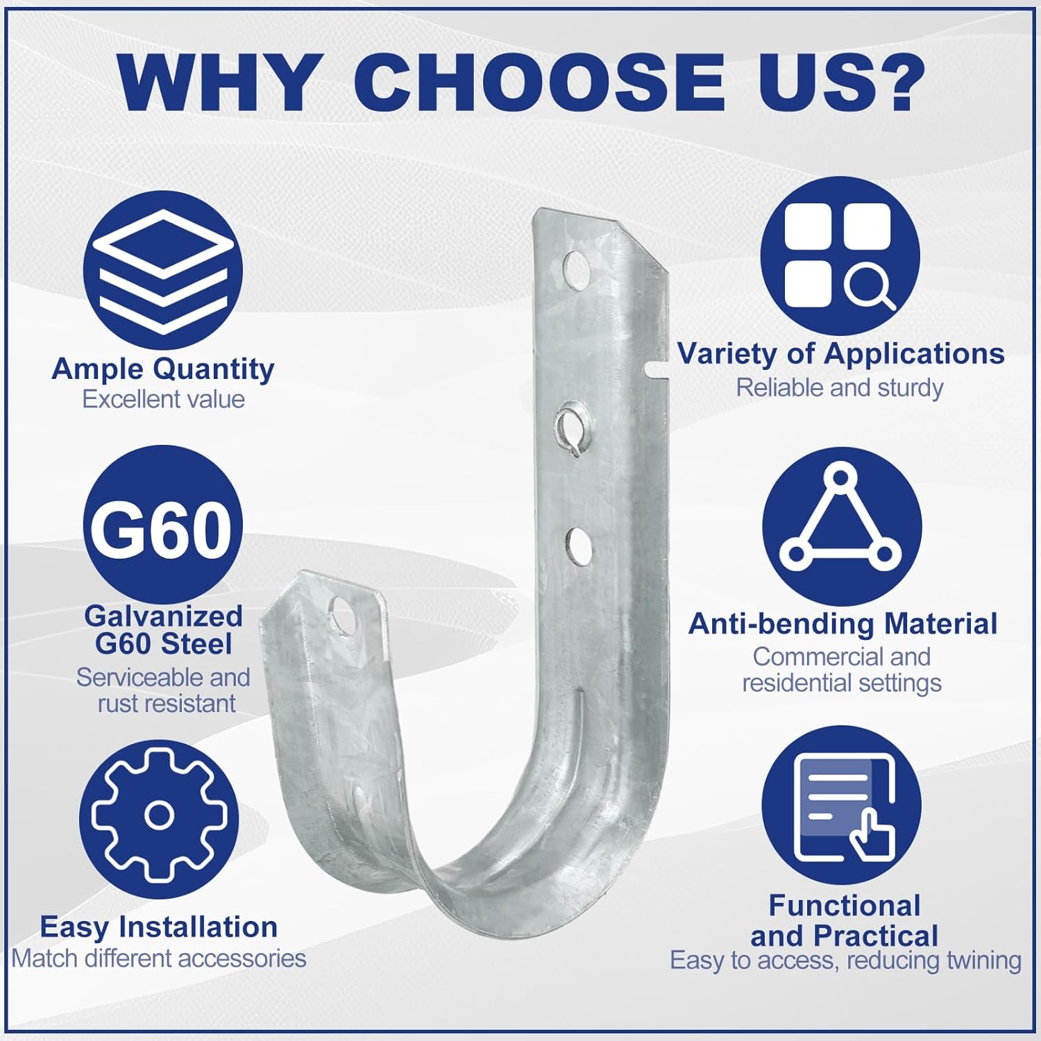 - Robust Material: the j hooks for hanging are constructed from dependable and rust resistant G60 galvanized steel, the heavy duty structure imparts them the ability to withstand regular wear and tear, and these j hooks can hold up to 60 lbs each; The hooks have UL certification, consolidating their reliability and toughness in supporting cables and wires