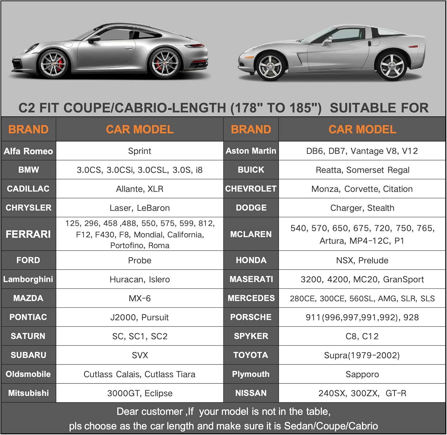 - ăDimension C2ăUniversal fit for sedan/Coupe/Cabrio which length is 178-185 inch (Not for hatchback and SUV ). Suitable for BMW 3/4 Series, Mitsubishi lancer/Eclipse, Ferrari California, Lexus IS250C/IS350C etc.