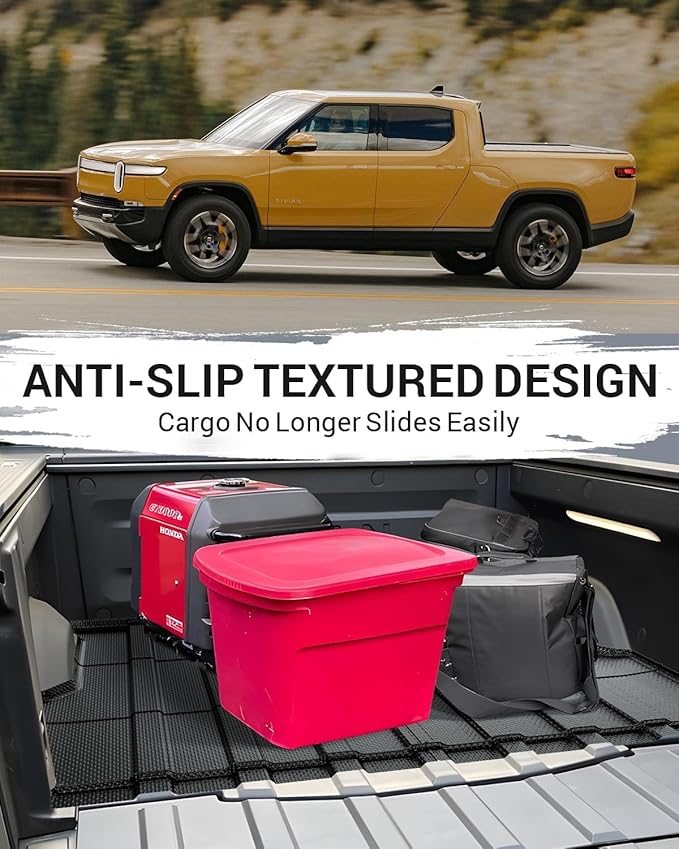 - Revolutionary Anti-Slip Texture, Safety Assured: Safety is our utmost priority. The Rivian R1T Bed Mat features an exclusive patented anti-slip texture design that keeps your cargo firmly in place, even on the roughest roads. No matter how far you travel, your goods stay secure and stable, giving you complete peace of mind on every journey.