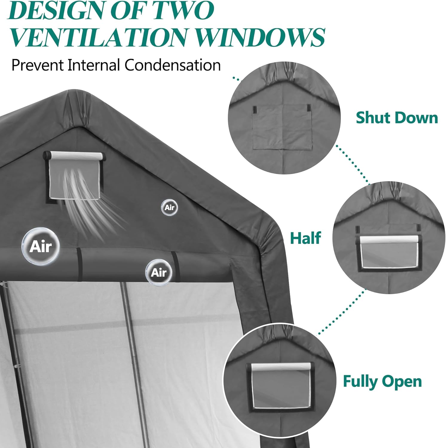 - 🚙170G WATERPROOF CANOPY COVER: Our Storage Shelter is made of waterproof 170g PE tarp with Roll-up Ventilation Windows. Heavy-duty Zipper Design