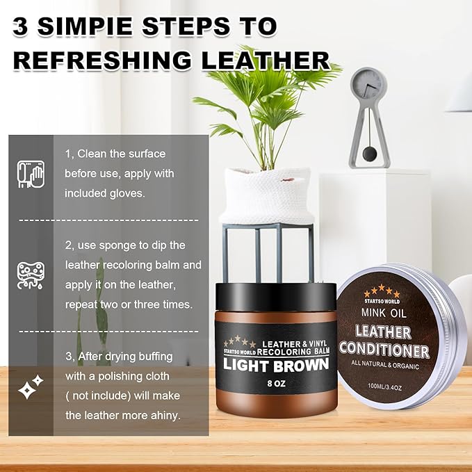 - Leather Recoloring Balm & Mink Oil: Startso world Leather recoloring balm exclusive formulated to fast drying and easy to use,restore fading color leather furniture surface to its former glory. Polished leather with Mink oil will make a longer lasting finish.
