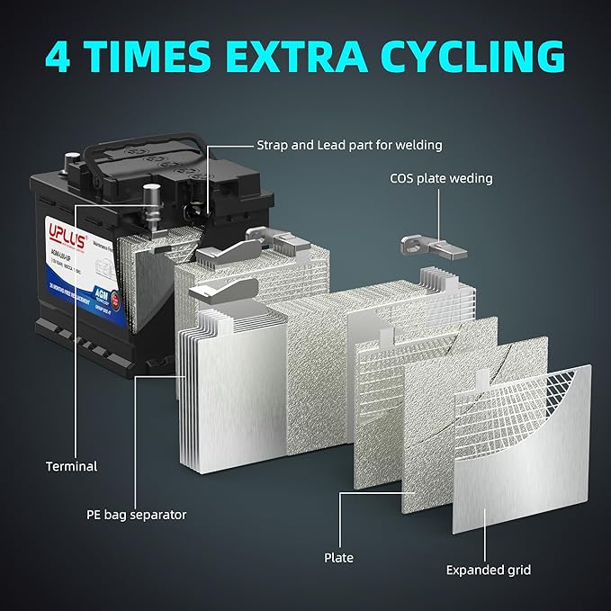- 4 TIMES EXTRA CYCLING --- High density negative paste and Enhanced life alloy or Silver Calcium stamped alloy.Uplus Start and Stop AGM battery has 4 times extra cycle life compared to standard conventional batteries.