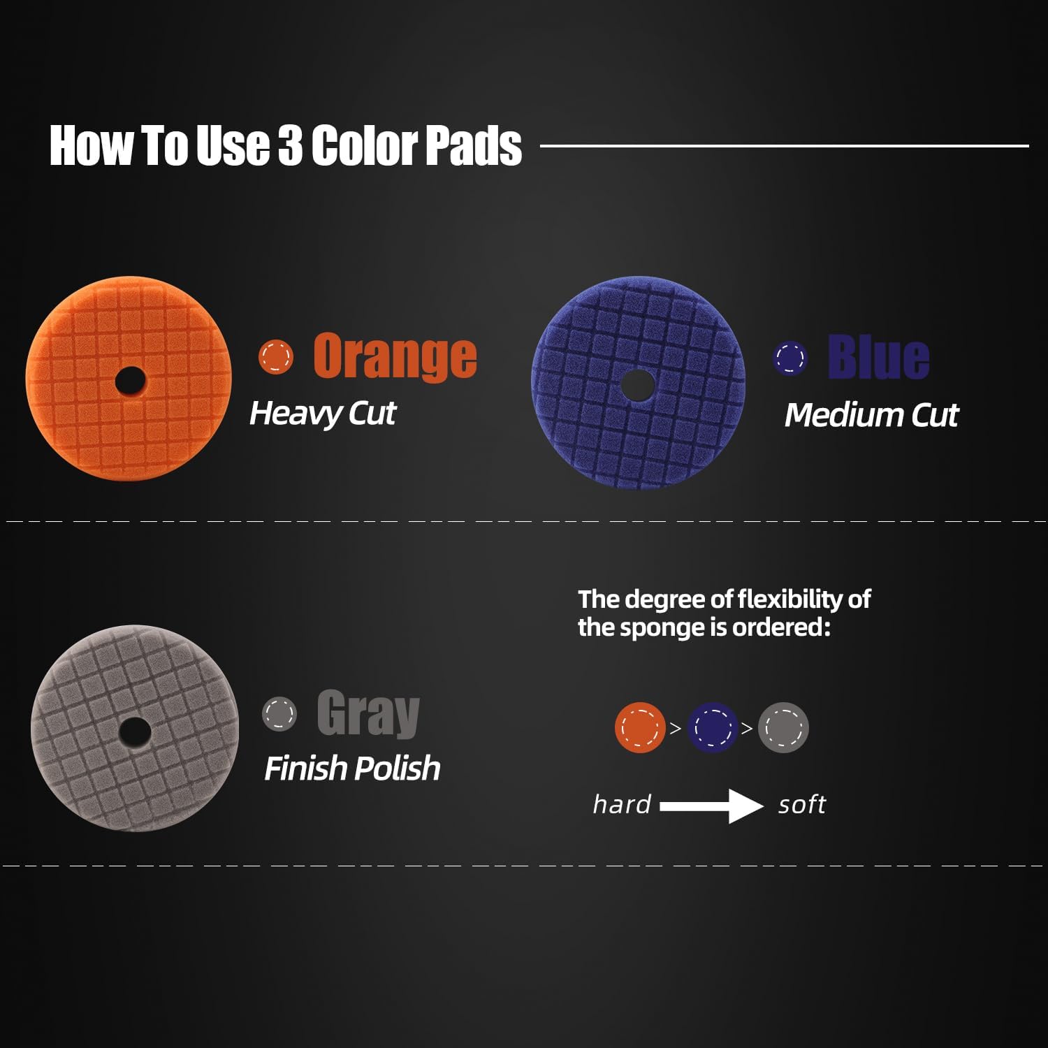 - Usage: Sponge pads come in three colors: orange for re cutting, blue for mid cutting, and gray for fine polishing and oiling. Suitable for removing car scratches, headlight wear, etc., achieving ideal polishing results.
