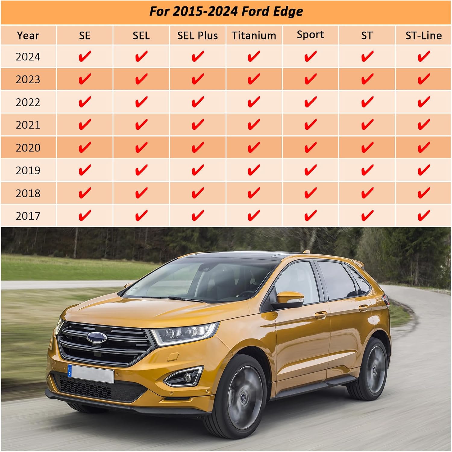 - TPE MATERIAL:Floor mats for Ford Edge 2015-2024 are made of Thermoplastic Elastomer(TPE) materials, which makes car floor mats both soft and durable. This kind of high quality materials even in extrem weather.