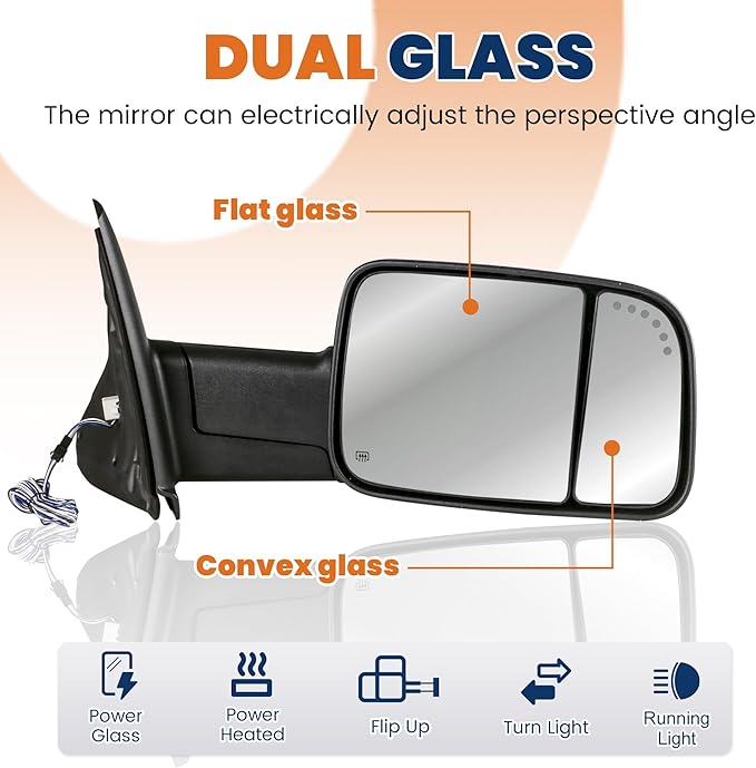 - Feature: KUIPERAUTO Black Housing Towing Mirror comes with White DRL, LED Turn signal light, Arrow Light, Power Adjustable Glass, Power Heated, Manual Fold.(NOTE: White DRL you need to manually connect from outside.Turn Signal Light is Orange Red.)