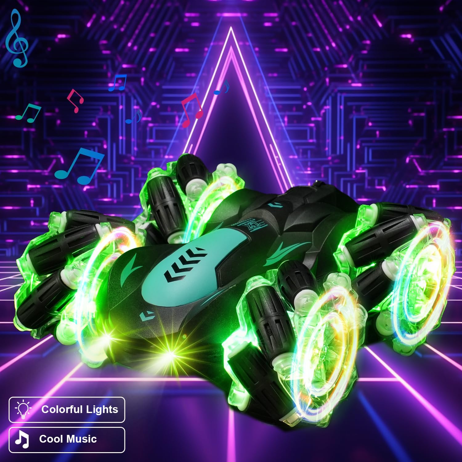 - 【FULL FUNCTIONAL REMOTE CONTROL CAR】Main Functions: Forward/backward,turn right/left, extreme 360 degree spins, double-sided 4WD driving with colorful lights and music, DEMO, diagonal drifting, drifting side by side, standing forward, 360 degree standing spins. The rc stunt car has 1x 3.7V /800 mAh rechargeable battery. The gesture stunt car can play 20-30mins.