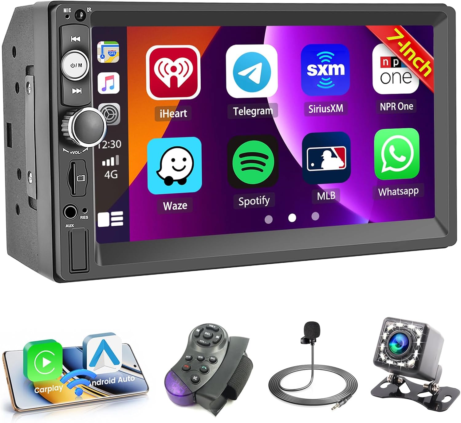 - Rear View Camera Input & Steering Wheel Control: Apple CarPlay radio is equipped with a 170°viewing angle and waterproof rear view camera. The 7 inch touchscreen will automatically display the parking image when you put the car into reverse gear, safer and easier. Use the steering wheel buttons to control the car audio, which is more convenient for operation and safer for driving.