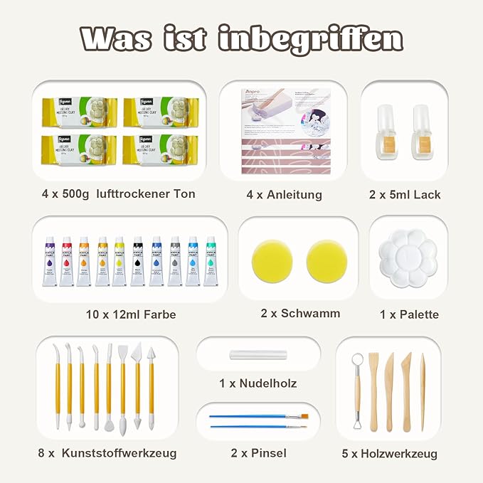 Anpro Craft Air Dry Clay Kit for Adults - Ultimate Beginners Pottery Kit with Clay, Tools, Paints, Brushes & Varnish | DIY Craft Kit for Home