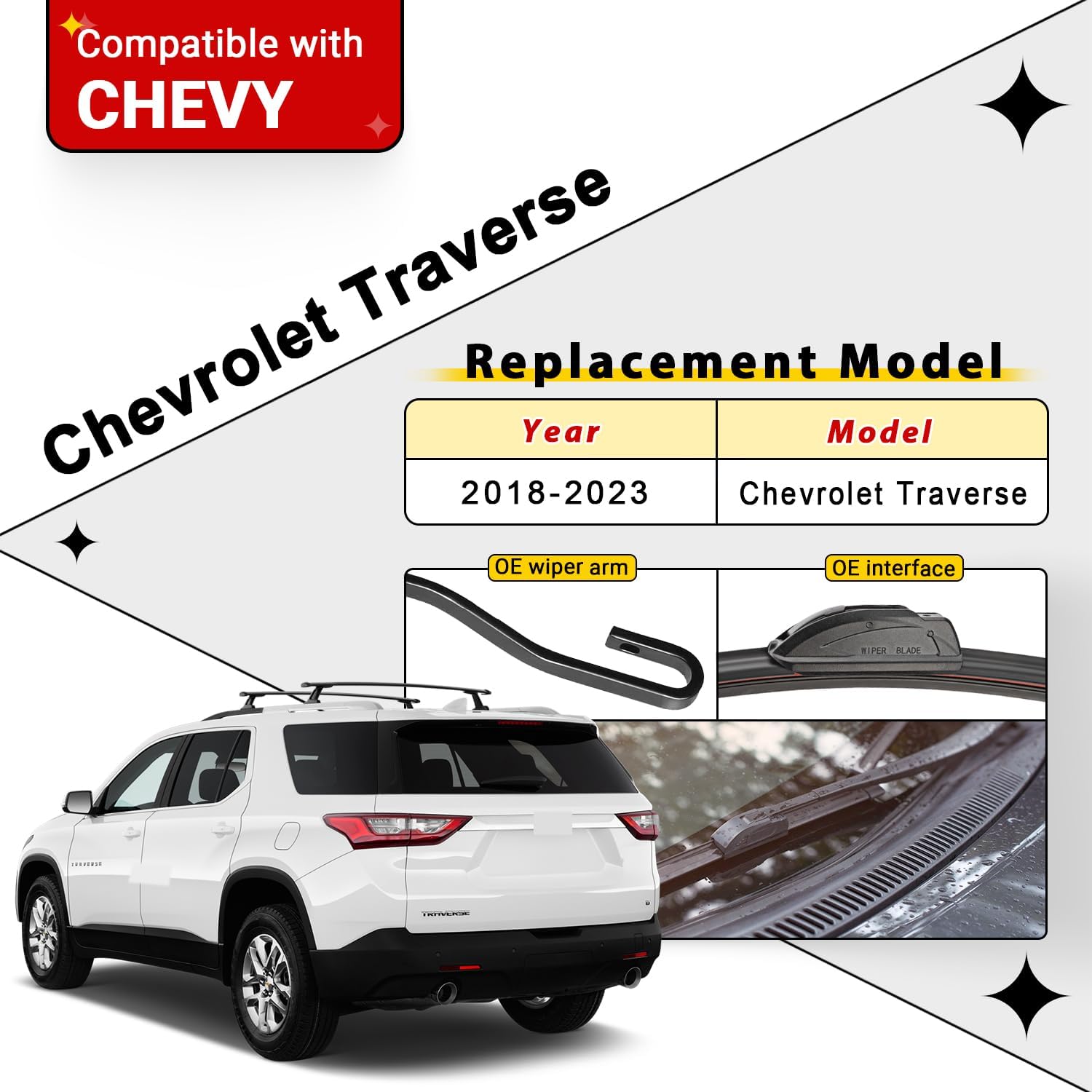 - {FITMENT}: Replacement for 2018 2019 2020 2021 2022 2023 Chevy Chevrolet Traverse 24inch + 20inch front with 10inch rear windshield wiper blades.