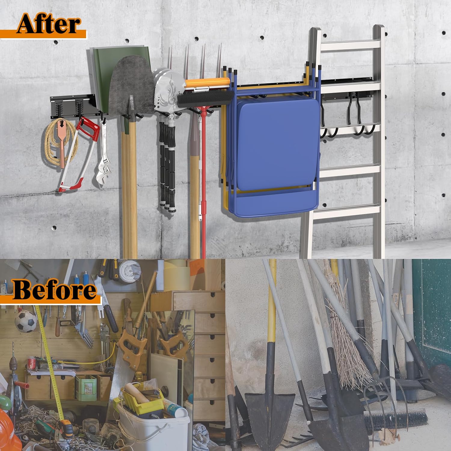 - Easy Installation & Simple Use:Garage tool organizer wall mount come with installation instructions, included screws and wall anchors to help you install quickly. The hook on the rail can also be moved freely to accommodate tools of different sizes.