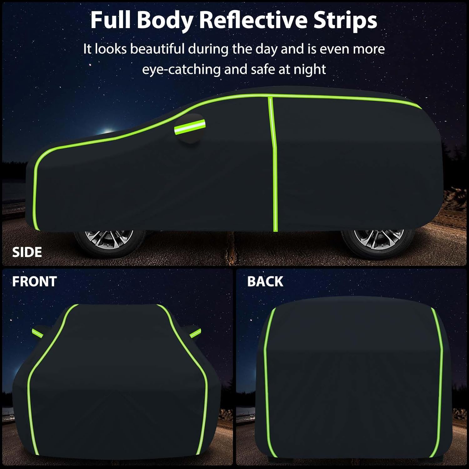 - 【Professional design】(1)The car cover has door zippers on both sides, making it convenient for us to retrieve our car contents at any time without the need to remove the cover again. (2)The entire vehicle is equipped with green reflective strips, which can allow pedestrians and vehicles to see the outline of your car in the dark at night, avoiding accidents. (3)There are straps on all four wheels to better secure the car cover and prevent it from being blown away by strong winds. (4)Provide two extra long ropes to better secure the vehicle body, making it less likely to be blown away even in typhoon weather.
