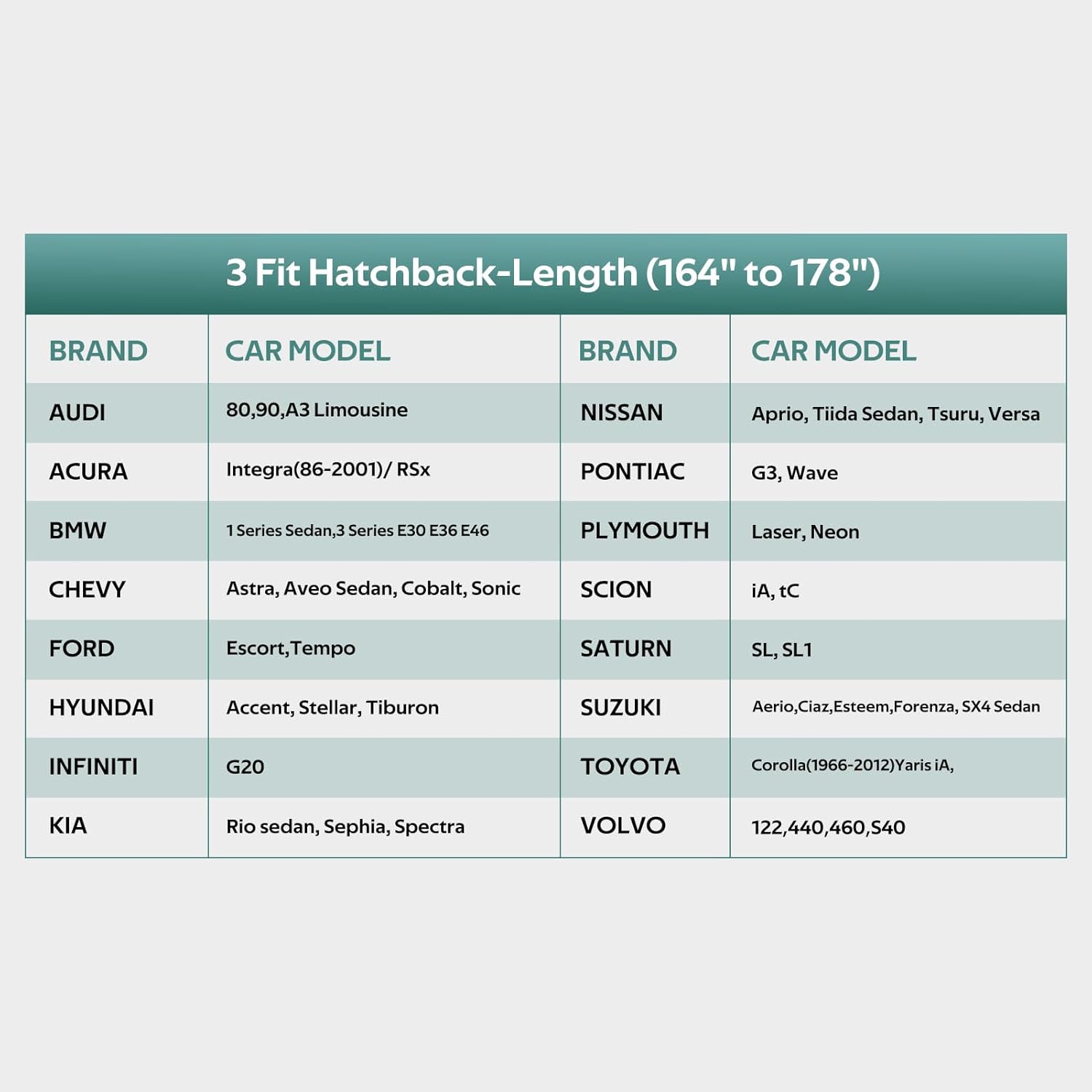 - Coverage : Hatchback car body (164'' to 178'')