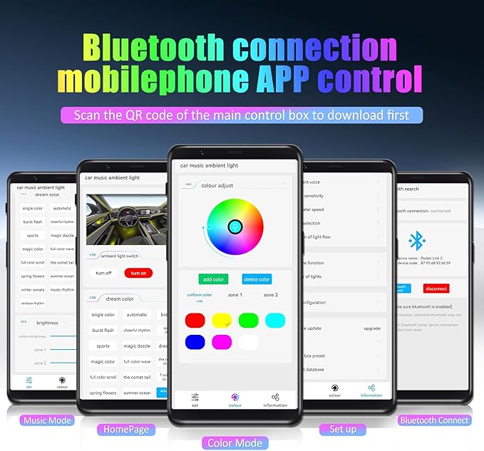 - Cooler and More Lighting Modes-built-in sensitive microphone, your car lights can dance to the rhythm of your favorite songs, more dynamic mode choices, and vivid and colorful lights to enhance your driving experience