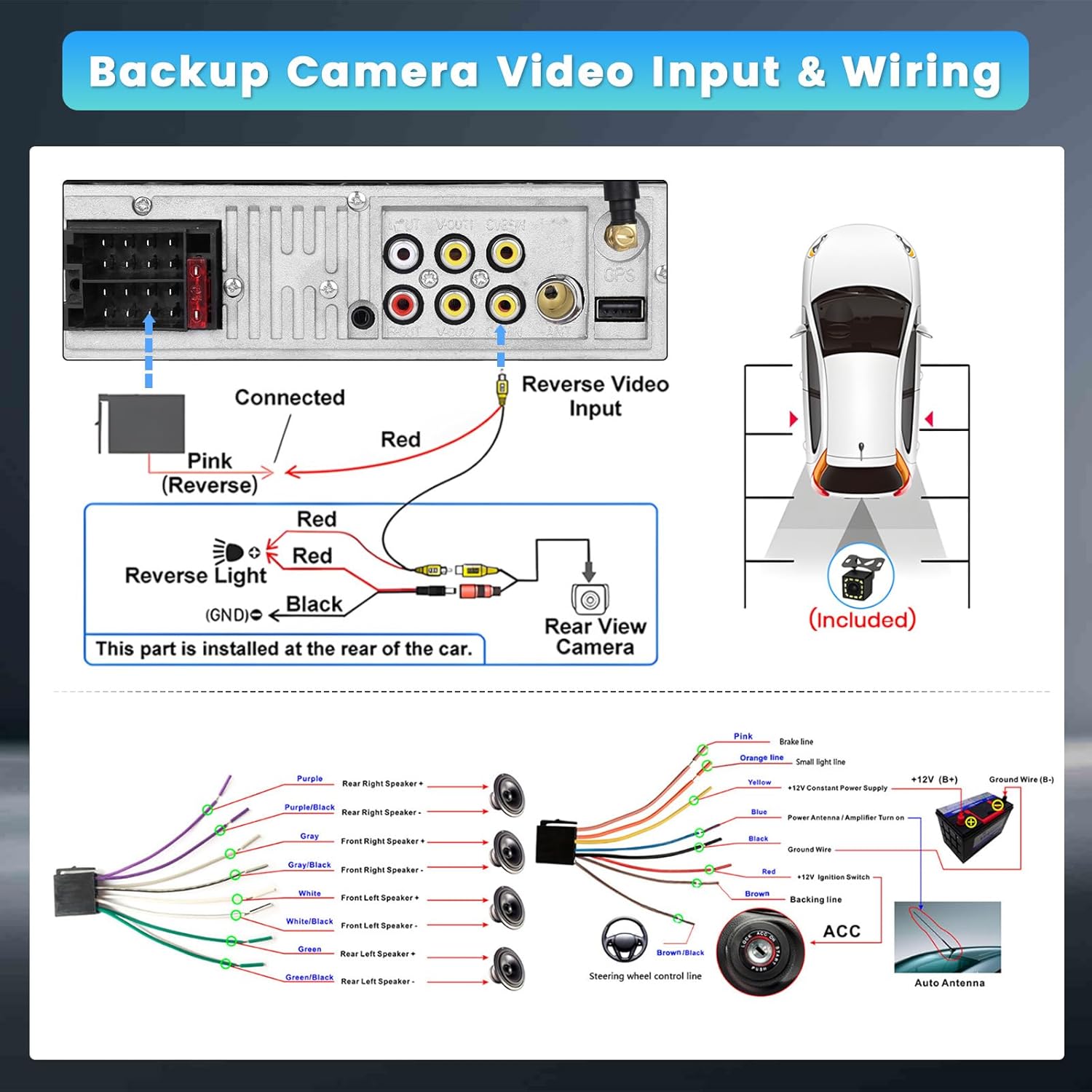 - 【HD Backup Camera & Steering Wheel Controls】Equipped with a 170° viewing angle HD waterproof backup camera, the single din car head unit automatically displays a clear image when reversing. Steering wheel functions are programmed to work flawlessly, allowing you to focus on driving for increased safety and convenience